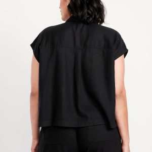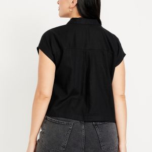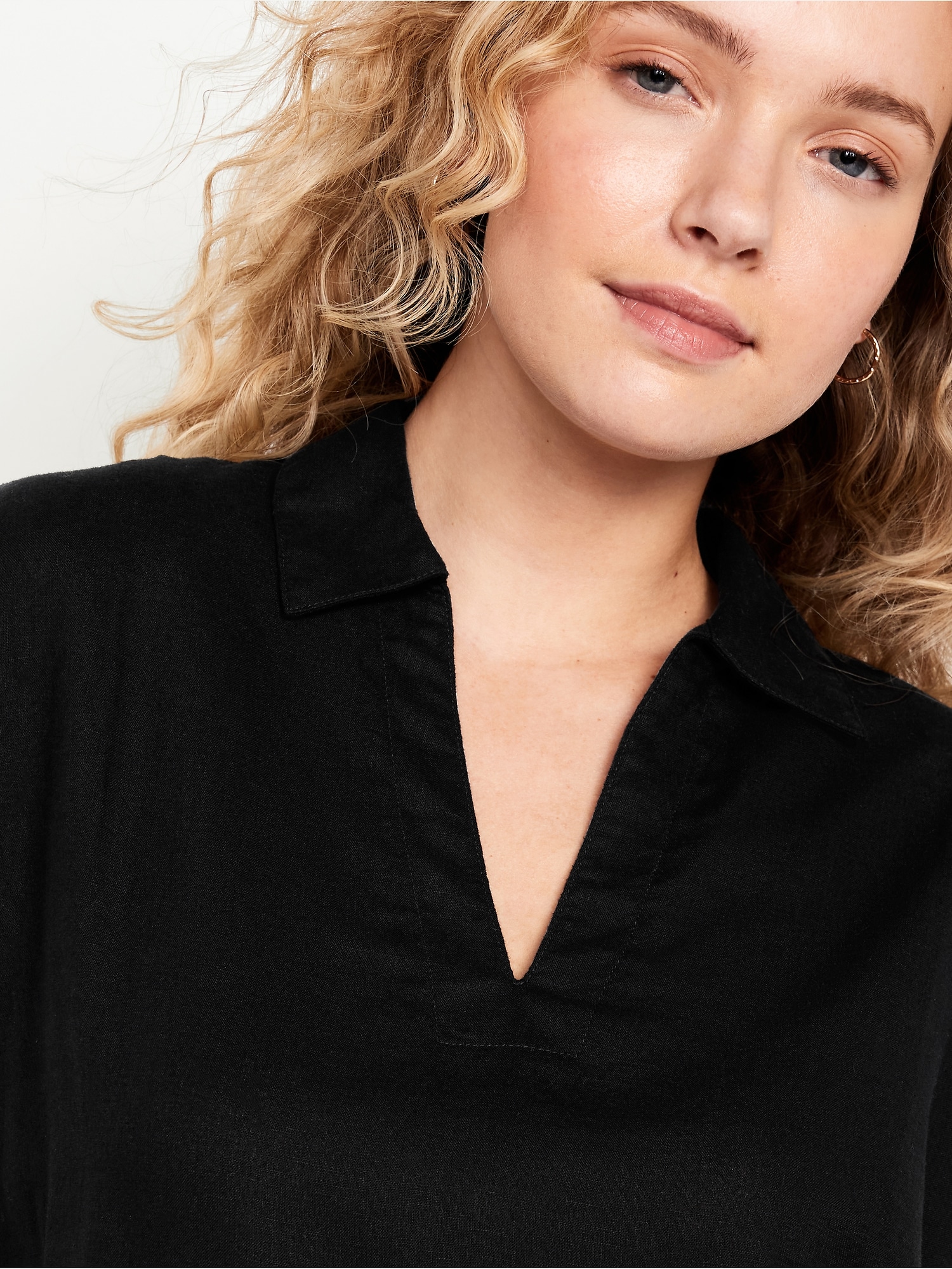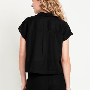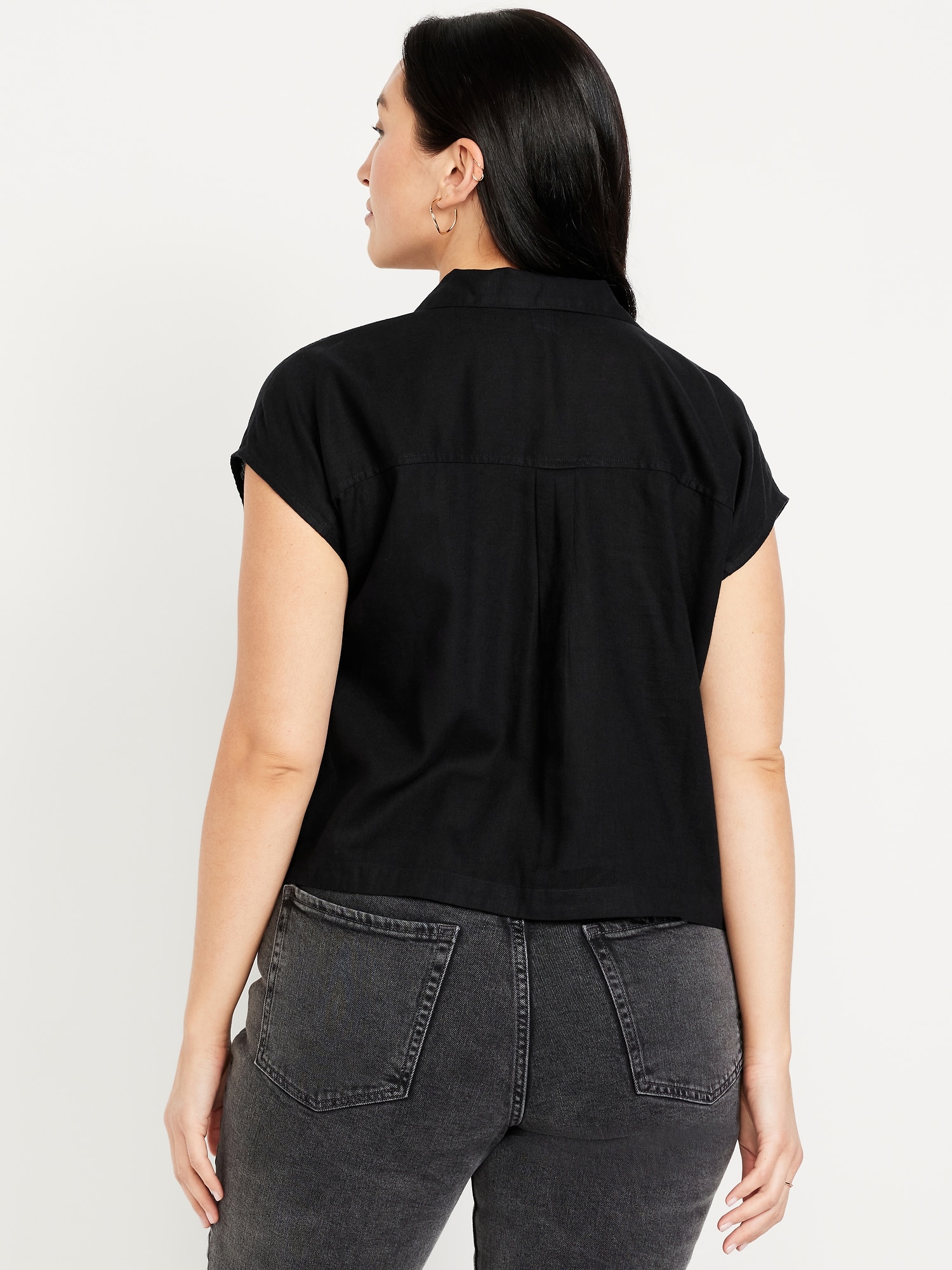Linen-Blend Cropped Popover Shirt: spread v-neck collar, short dolman sleeves, seamed back yoke, easy popover style, #764183