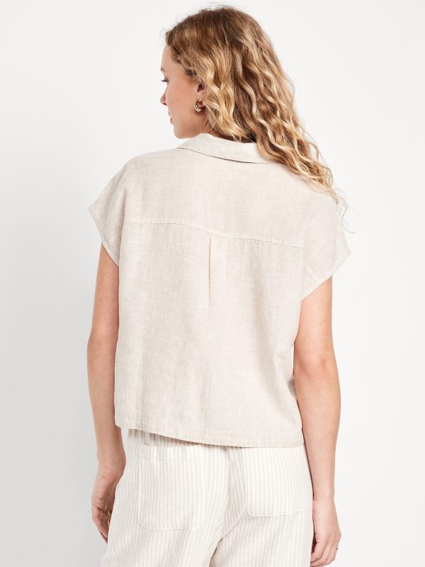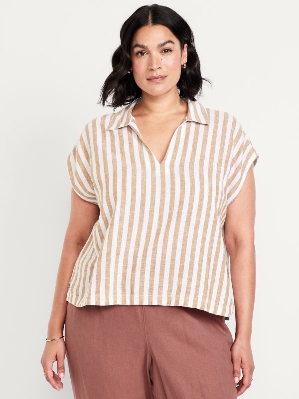 Linen-Blend Cropped Popover Shirt: spread v-neck collar, short dolman sleeves, seamed back yoke, easy popover style, #764183