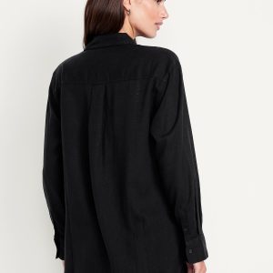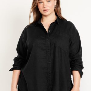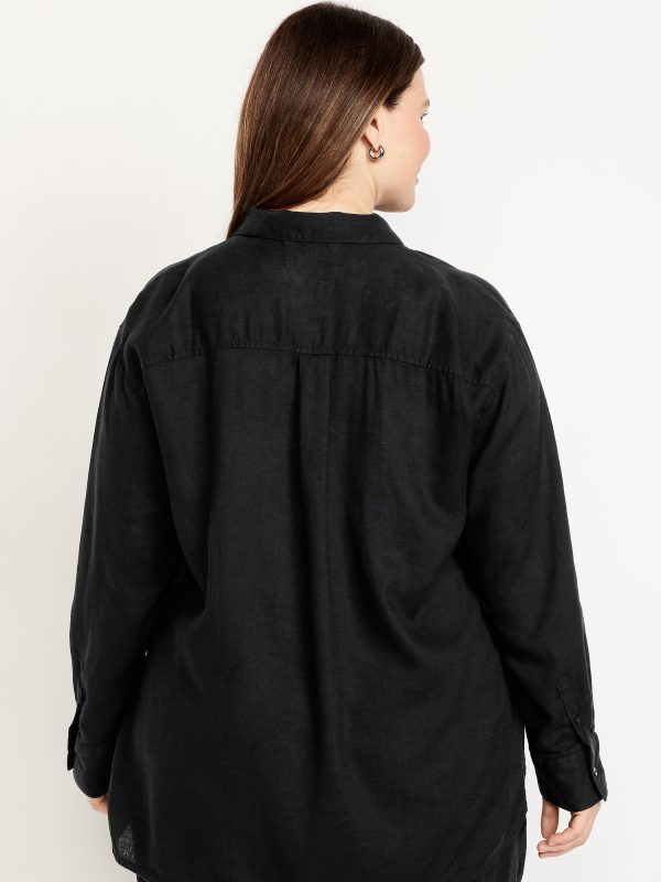 Linen-Blend Loose Button-Down Shirt: spread collar, long sleeves, buttoned cuffs, full-button front, patch chest pocket, curved hi-lo hem, all-over sun print, #745082