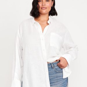 Linen-Blend Loose Button-Down Shirt: spread collar, long sleeves, buttoned cuffs, full-button front, patch chest pocket, curved hi-lo hem, all-over sun print, #745082
