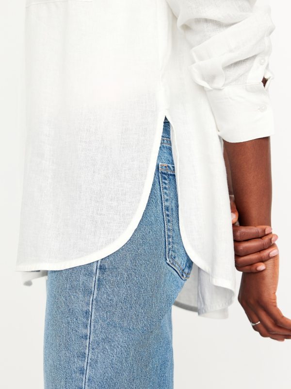 Linen-Blend Loose Button-Down Shirt: spread collar, long sleeves, buttoned cuffs, full-button front, patch chest pocket, curved hi-lo hem, all-over sun print, #745082
