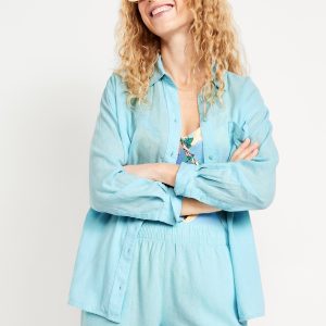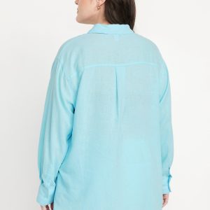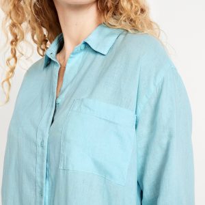 Linen-Blend Loose Button-Down Shirt: spread collar, long sleeves, buttoned cuffs, patch chest pocket, full-button front, striped print, curved hi-lo hem, #693623