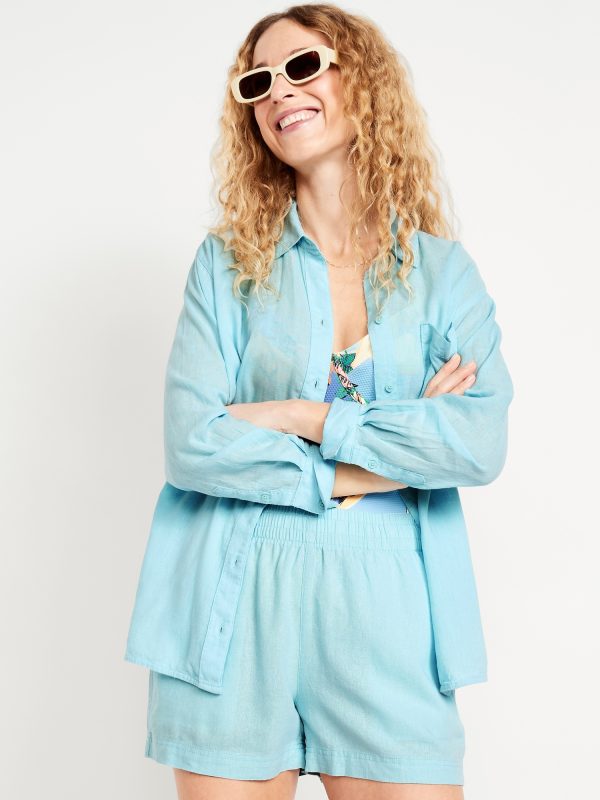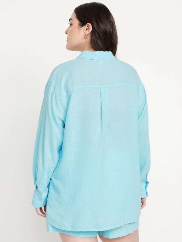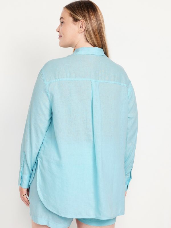 Linen-Blend Loose Button-Down Shirt: spread collar, long sleeves, buttoned cuffs, patch chest pocket, full-button front, striped print, curved hi-lo hem, #693623