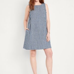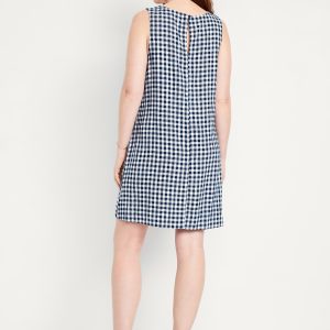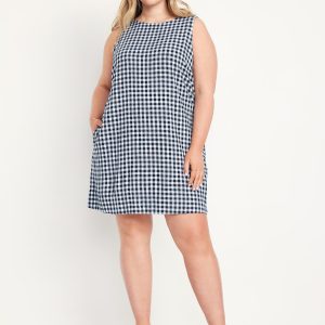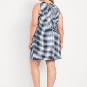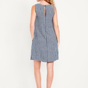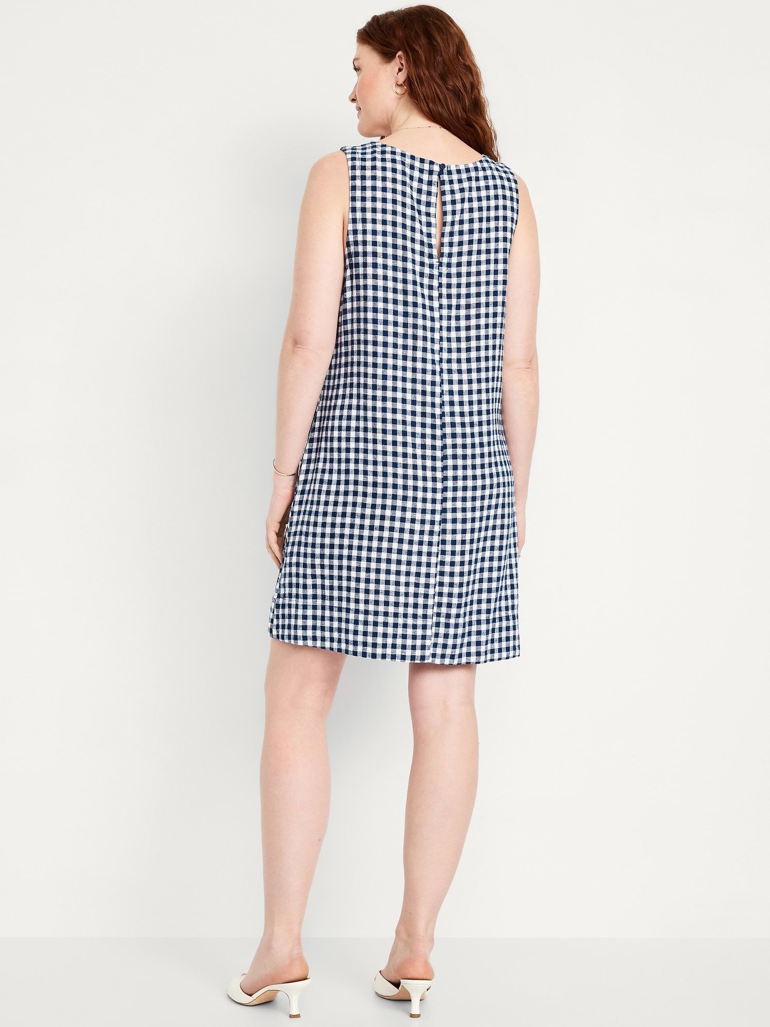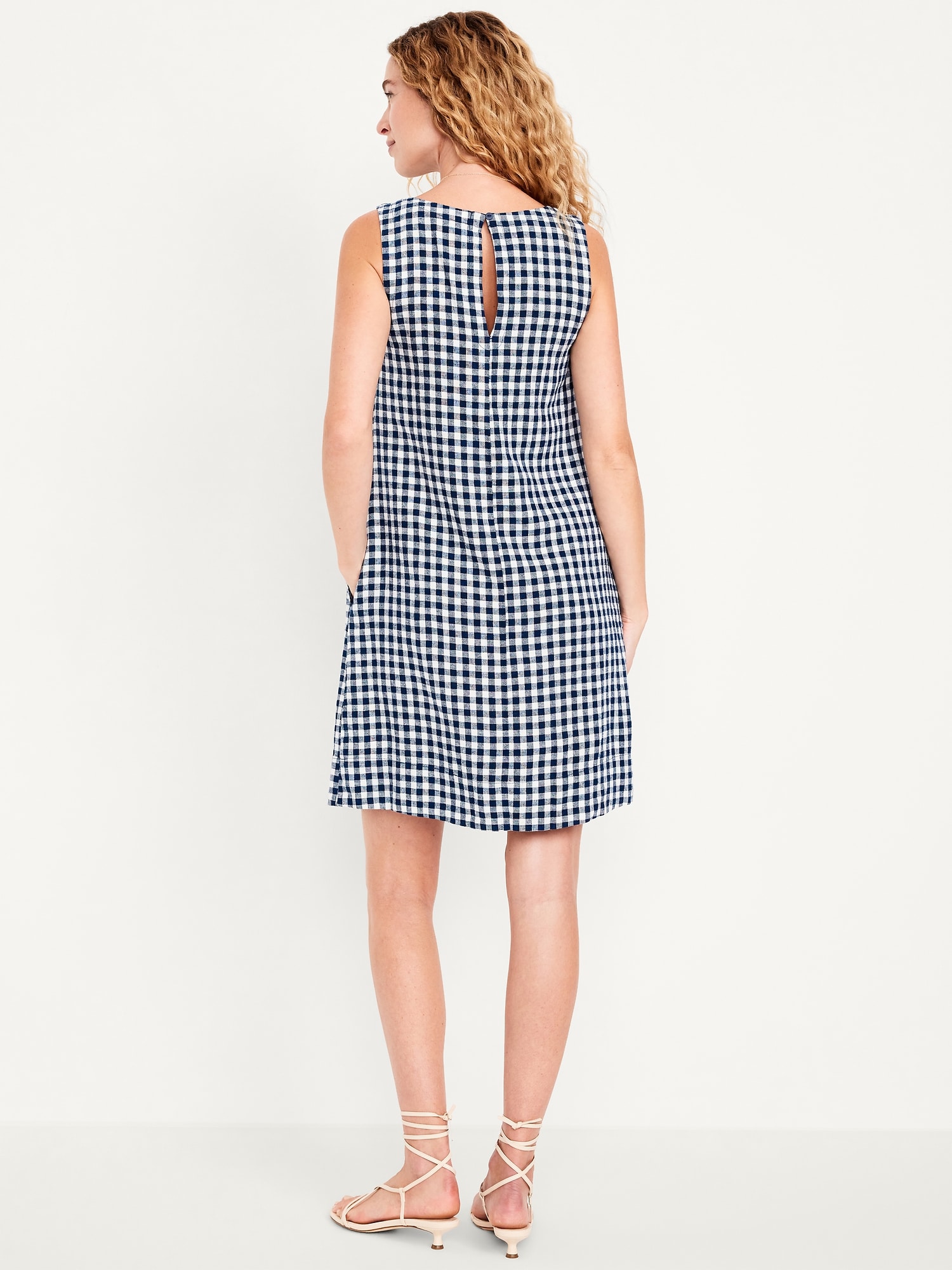 Linen-Blend Mini Shift Dress: high neck, sleeveless, side-seam pockets, button-loop closure at nape, darted bust, all-over floral and fruit print, #766928
