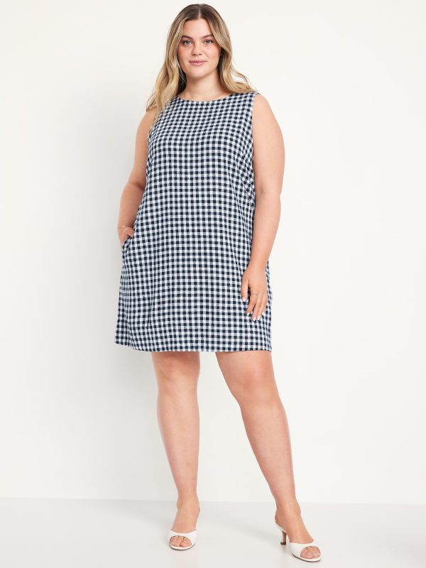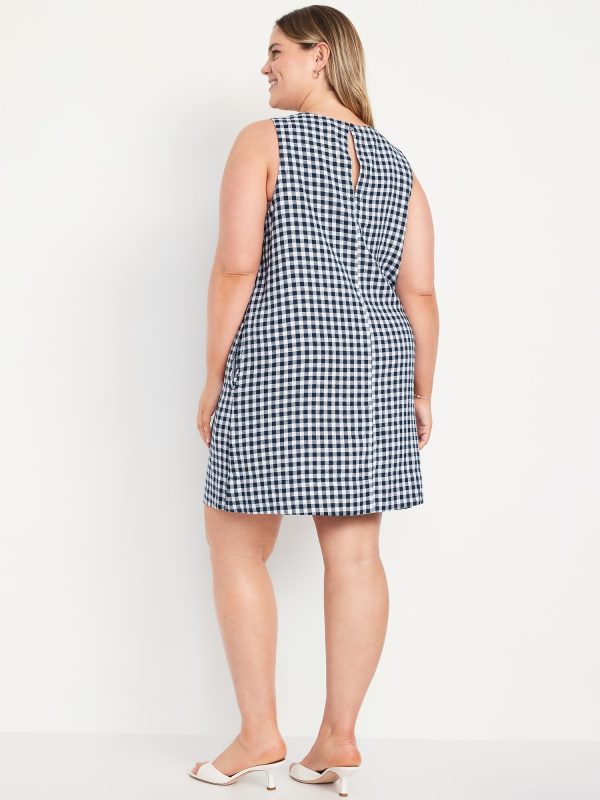 Linen-Blend Mini Shift Dress: high neck, sleeveless, side-seam pockets, button-loop closure at nape, darted bust, all-over floral and fruit print, #766928