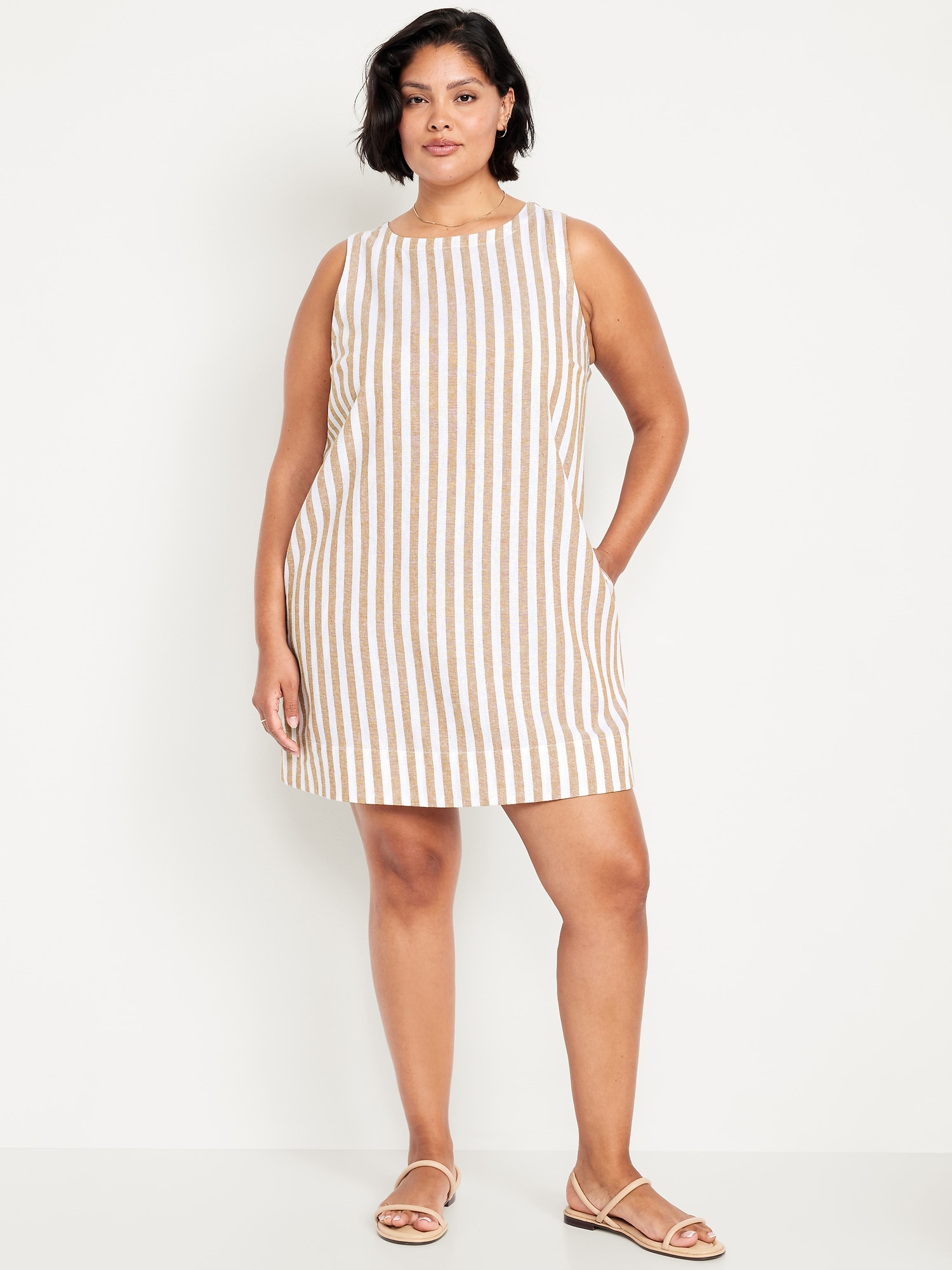 Linen-Blend Mini Shift Dress: high neck, sleeveless, side-seam pockets, button-loop closure at nape, darted bust, all-over floral and fruit print, #766928