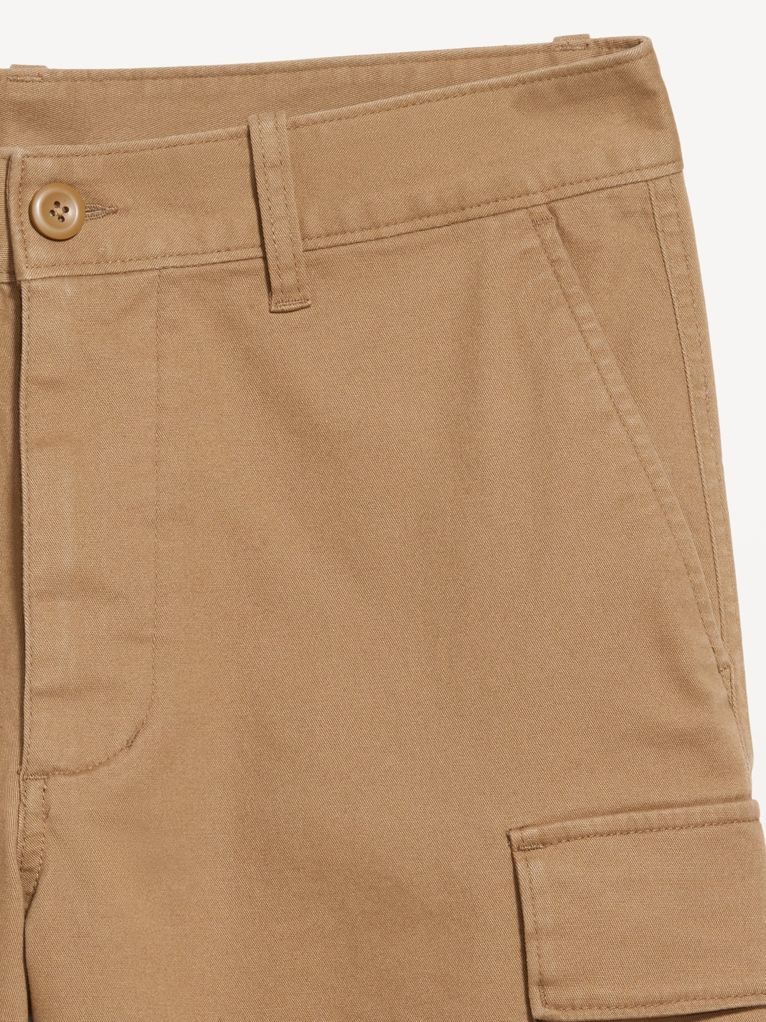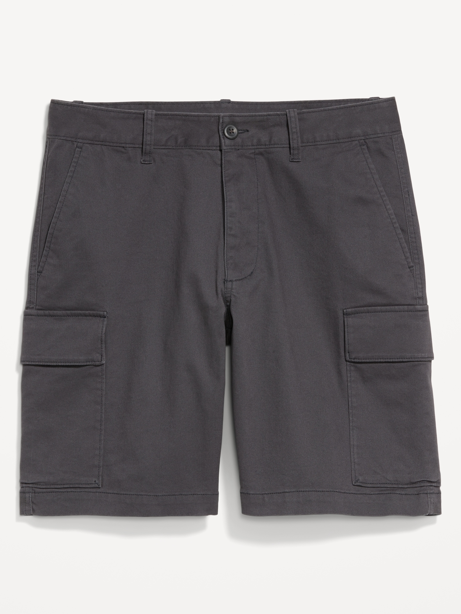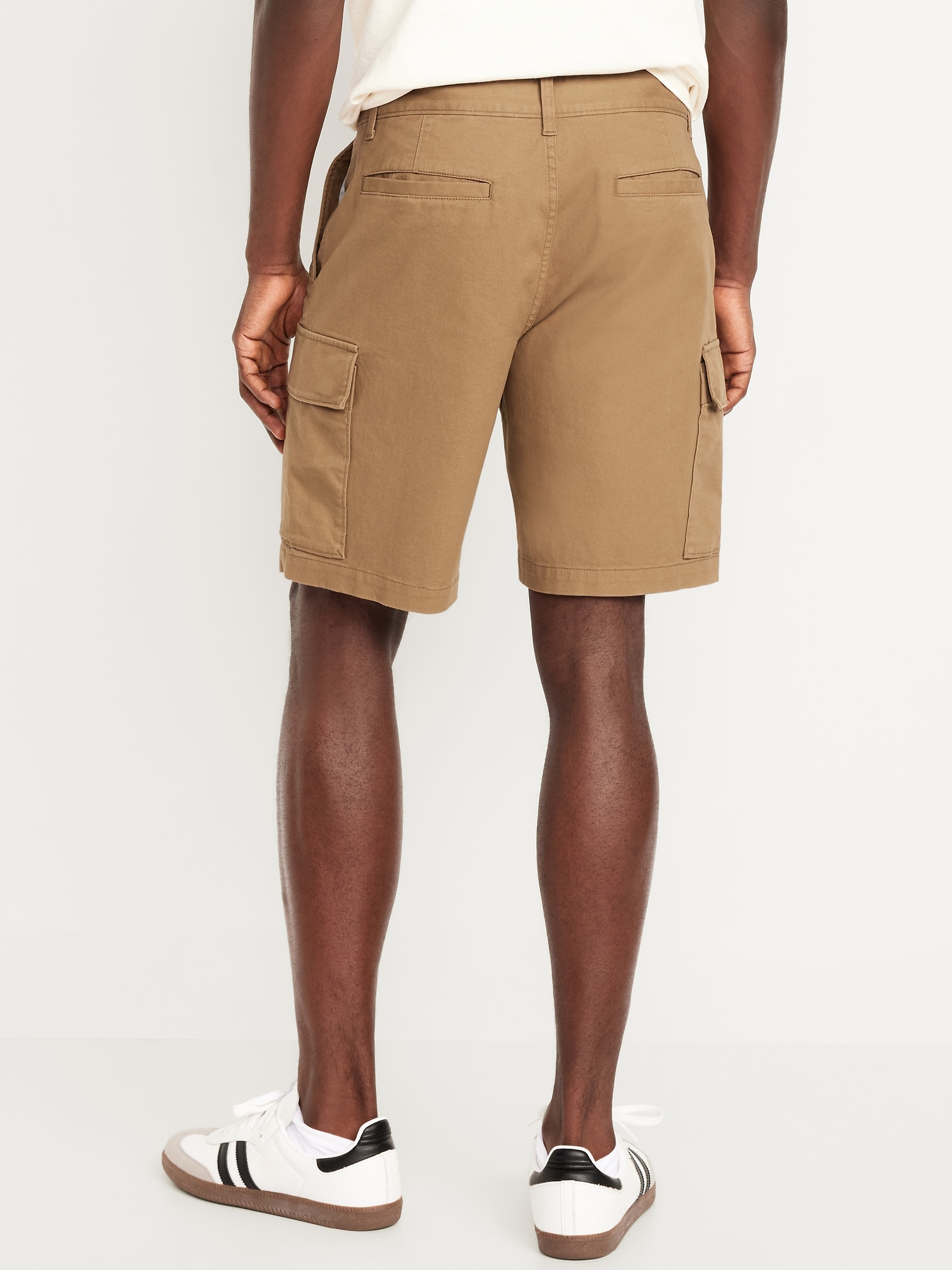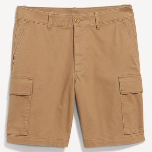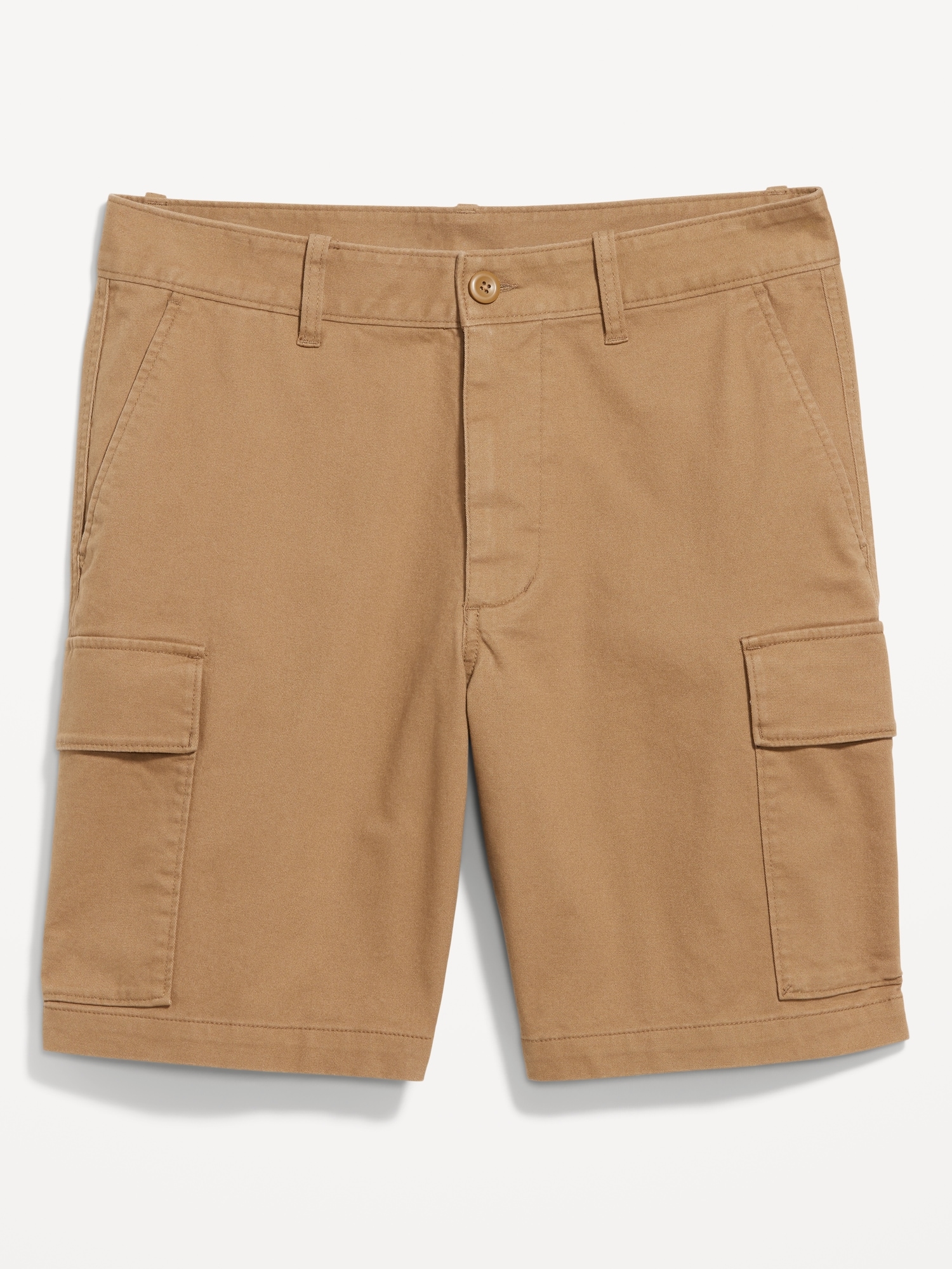Lived-In Cargo Shorts — 9-inch inseam: button front, belt loops, zip fly, diagonal front pockets, back welt pockets, flap-cargo pockets at thigh, #695513
