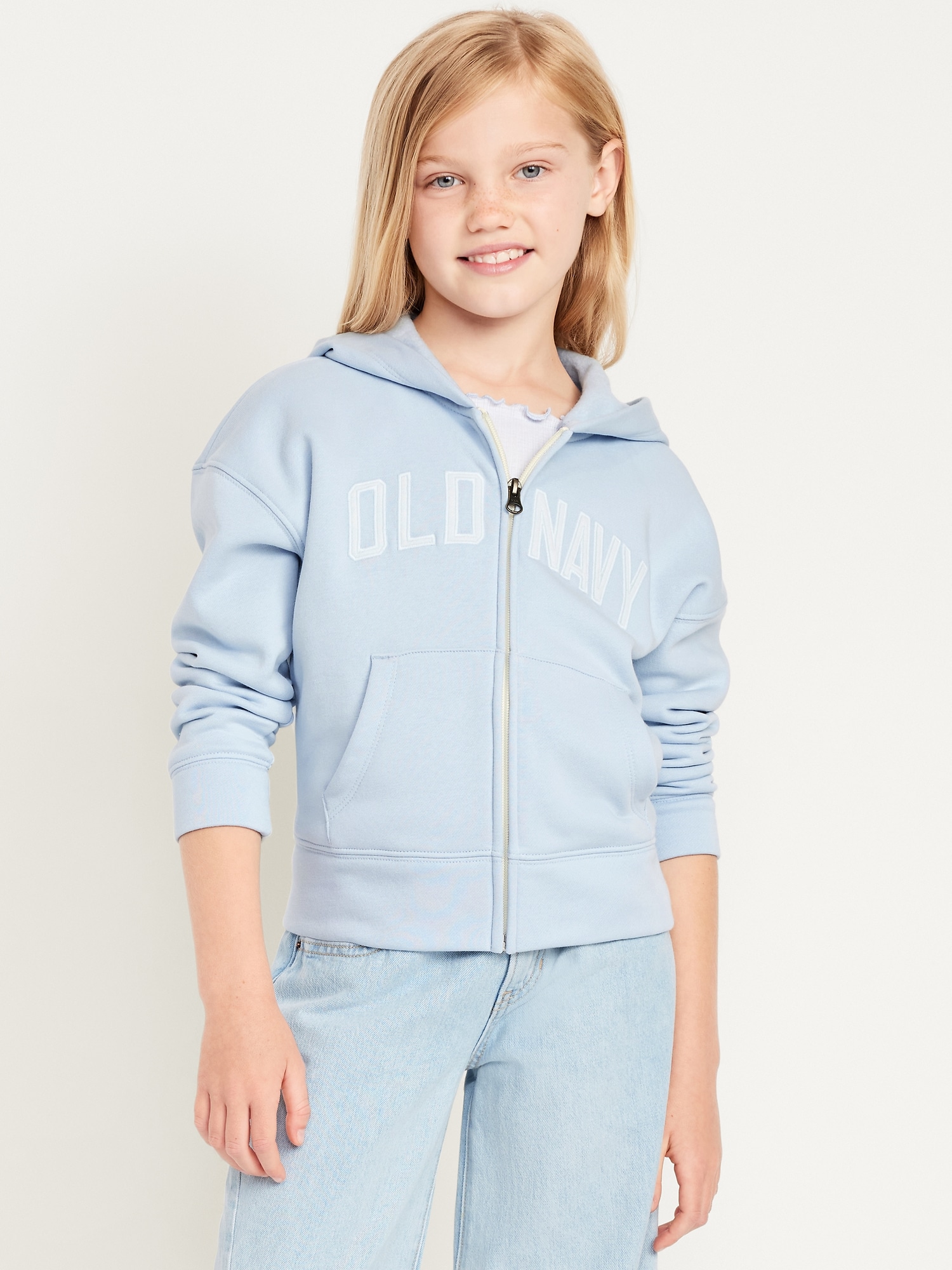 Logo-Graphic Zip Hoodie for Girls: built-in hood, long sleeves, full-length front zipper, embroidered logo graphic, banded hem, #871012