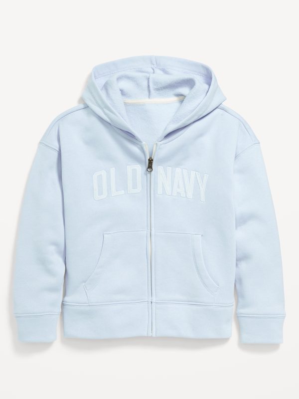 Logo-Graphic Zip Hoodie for Girls: built-in hood, long sleeves, full-length front zipper, embroidered logo graphic, banded hem, #871012