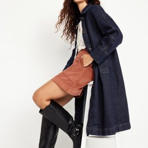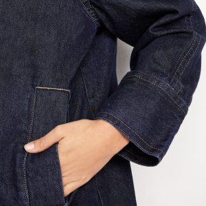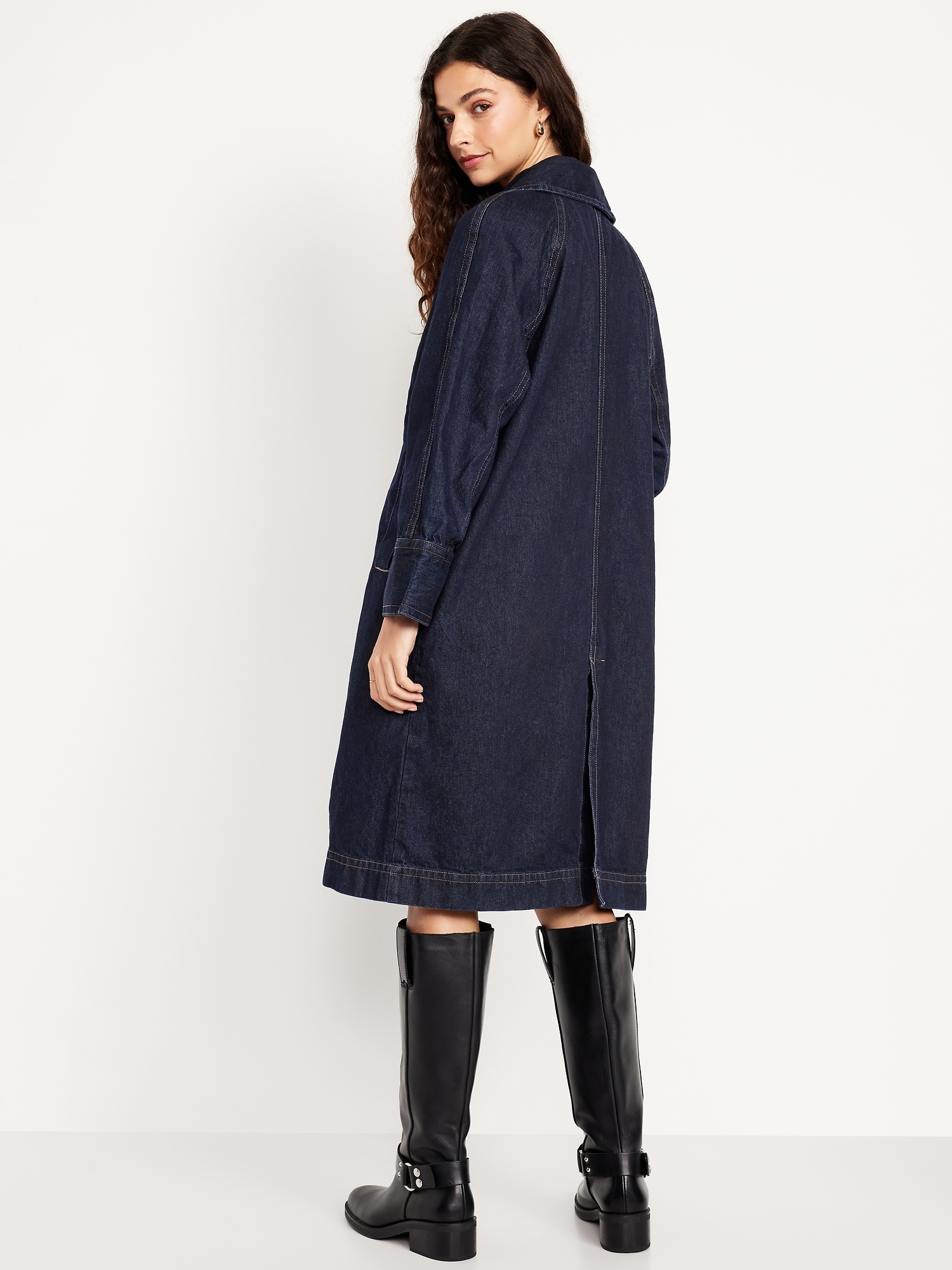 Long Denim Barn Coat: spread collar, long raglan sleeves, button front, front welt pockets, vented back hem, #790480
