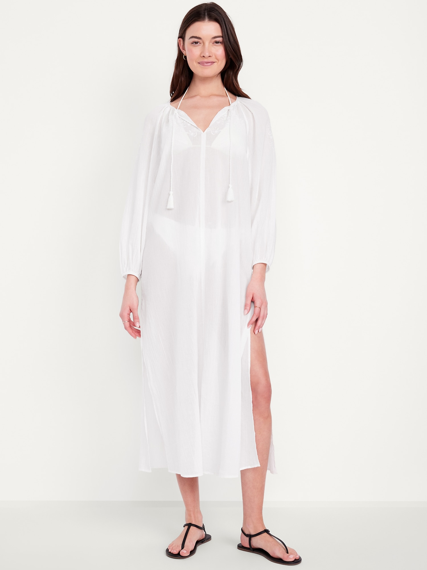 Long-Sleeve Gauze Kaftan: split tassel-front neck, long sleeves, elastic cuffs, split seams, #766932
