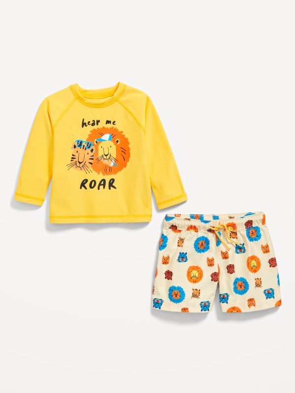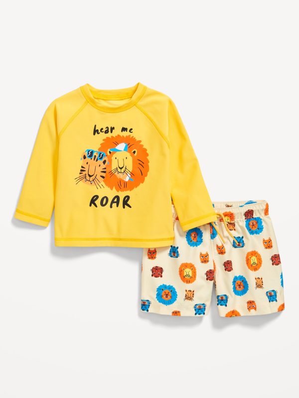 Long-Sleeve Rashguard Swim Top and Shorts Set for Baby: pack includes a rashguard swim top and coordinating swim trunks, crew neck, long raglan sleeves, coordinating swim trunks have elasticized, functional-drawstring waist, single patch pocket at back, online exclusive, #859270