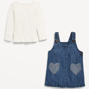 Long-Sleeve Ribbed T-Shirt and Chambray Dress Set for Baby: round neckline, long sleeves, coordinating dress, buttoned shoulder straps, side buttoned closure, heart patch pockets, #802742