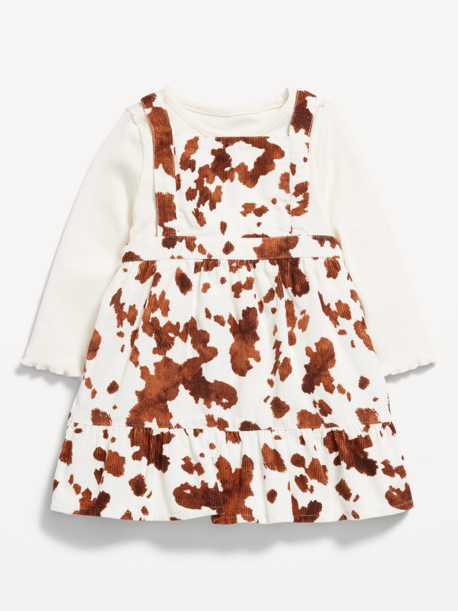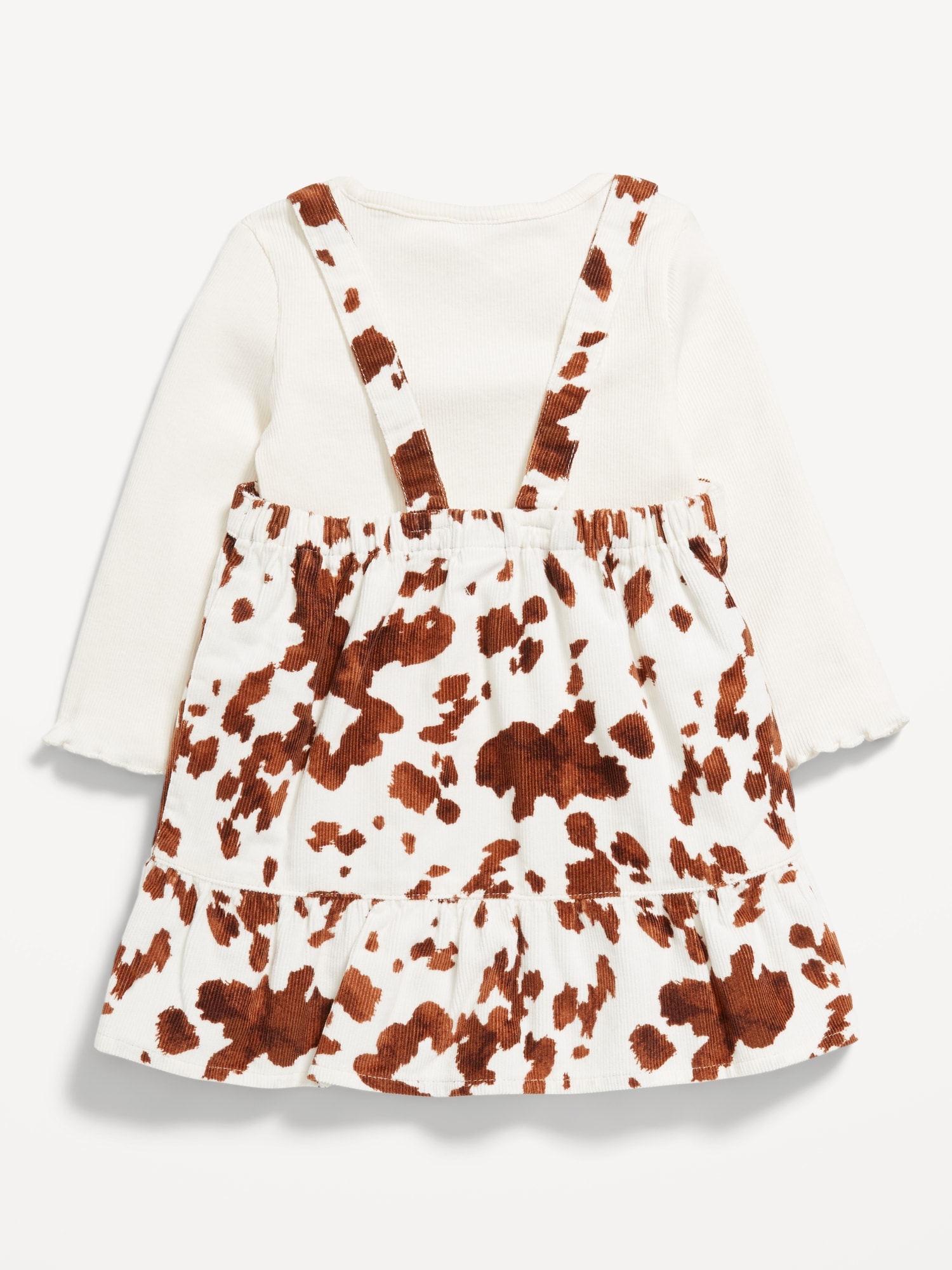 Long-Sleeve Ribbed T-Shirt and Corduroy Dress Set for Baby: round neckline, long sleeves, coordinating dress, wide shoulder straps, embroidered graphic at front, ruffled hem, #802750