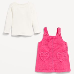 Long-Sleeve Ribbed T-Shirt and Corduroy Dress Set for Baby: round neckline, long sleeves, coordinating dress, buttoned shoulder straps, side buttoned closure, heart patch pockets, #802742