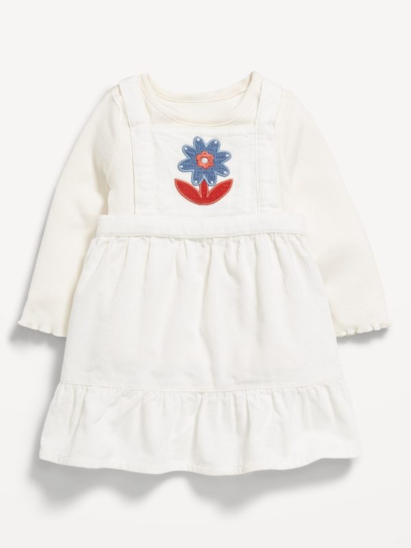 Long-Sleeve Ribbed T-Shirt and Corduroy Dress Set for Baby: round neckline, long sleeves, coordinating dress, wide shoulder straps, embroidered graphic at front, ruffled hem, #802750