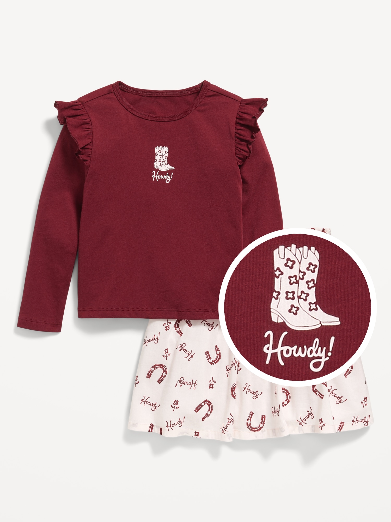 Long-Sleeve Ruffle T-Shirt and Skirt Set for Toddler Girls: Mix Match Go Productscoop neck, long sleeves, ruffle overlay along shoulders, matching skirt, elasticized waistband, all-over print, online exclusive, #805546