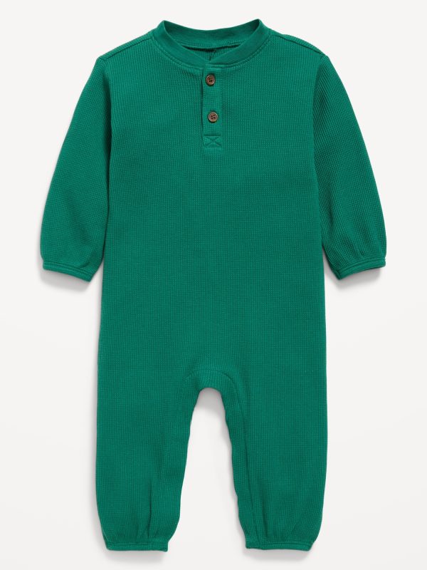 Long-Sleeve Waffle-Knit Henley One-Piece for Baby: crew neck, two-button henley placket, long sleeves, hidden snaps along inseam, #804450