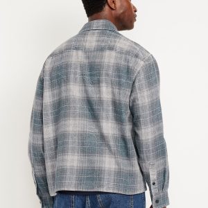 Loose Fit Cropped Plaid Flannel Shirt: spread collar, long sleeves with buttoned cuffs, full-button front, patch chest pocket, plaid print, #805557