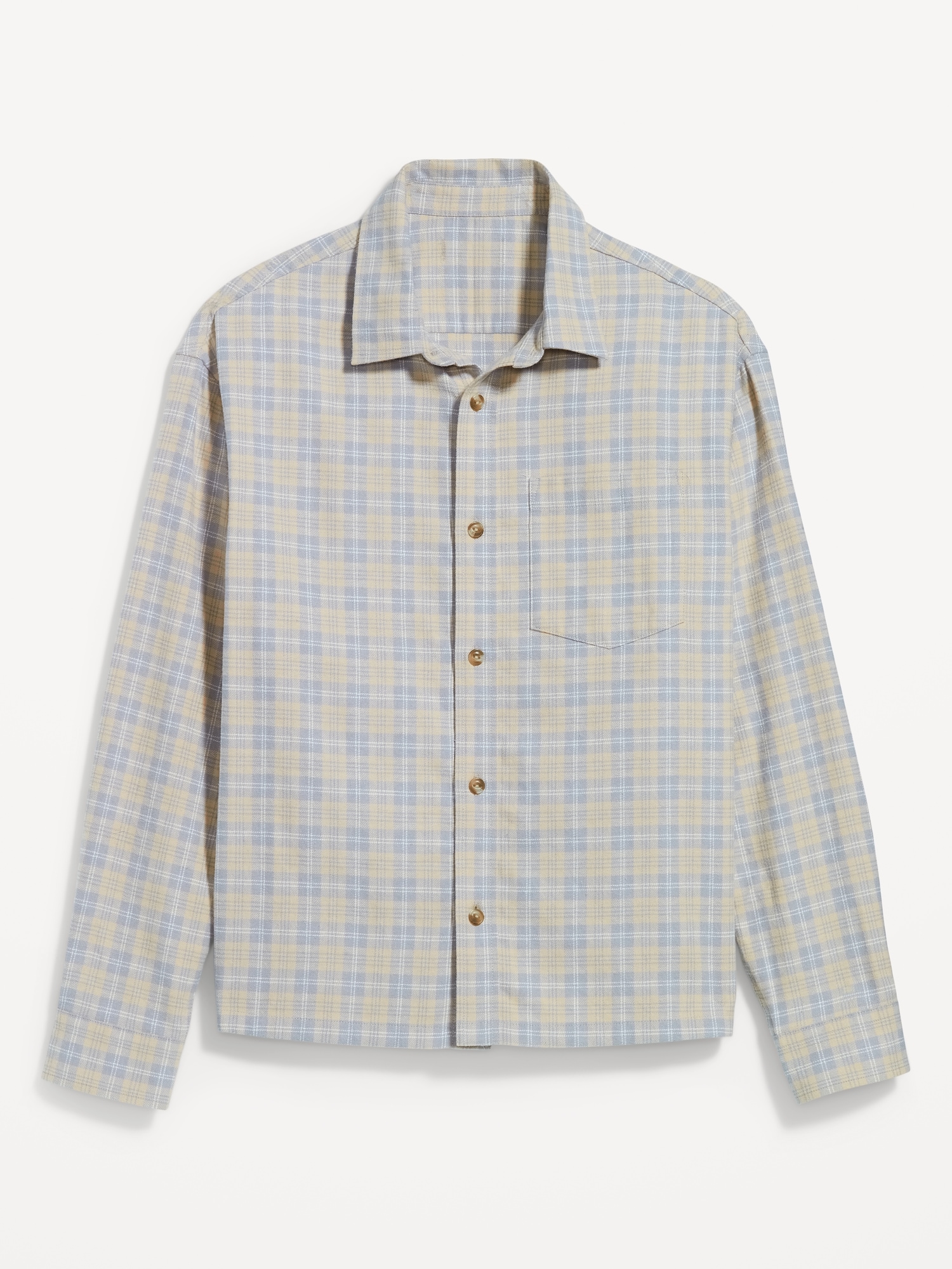 Loose Fit Cropped Plaid Flannel Shirt: spread collar, long sleeves with buttoned cuffs, full-button front, patch chest pocket, plaid print, #805557