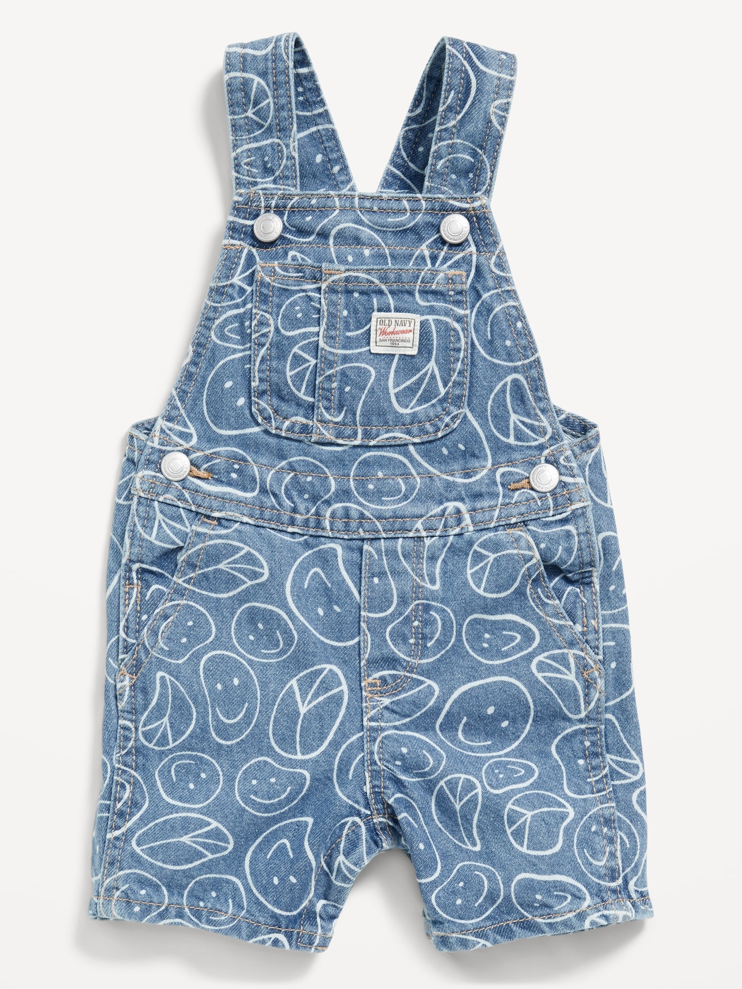 Loose Printed Jean Shortalls for Baby: wide adjustable straps, bib at front, snap-button closures at waist, ring-snaps along inseam, diagonal front pockets, patch pockets at back, all-over print, #694165