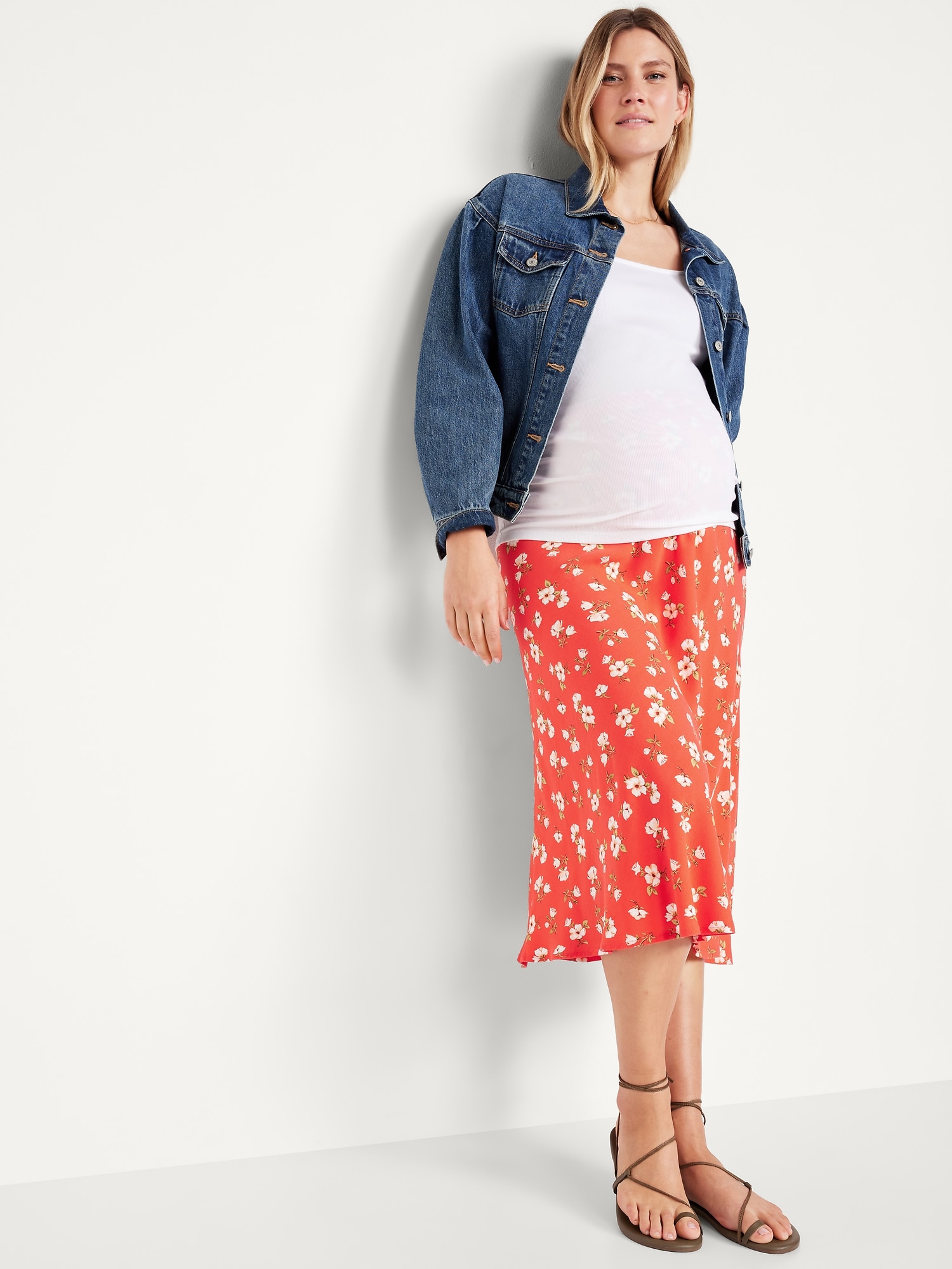 Maternity A-Line Midi Skirt: perfect for baby shower, elastic waistband, easy pull-on style, #719598