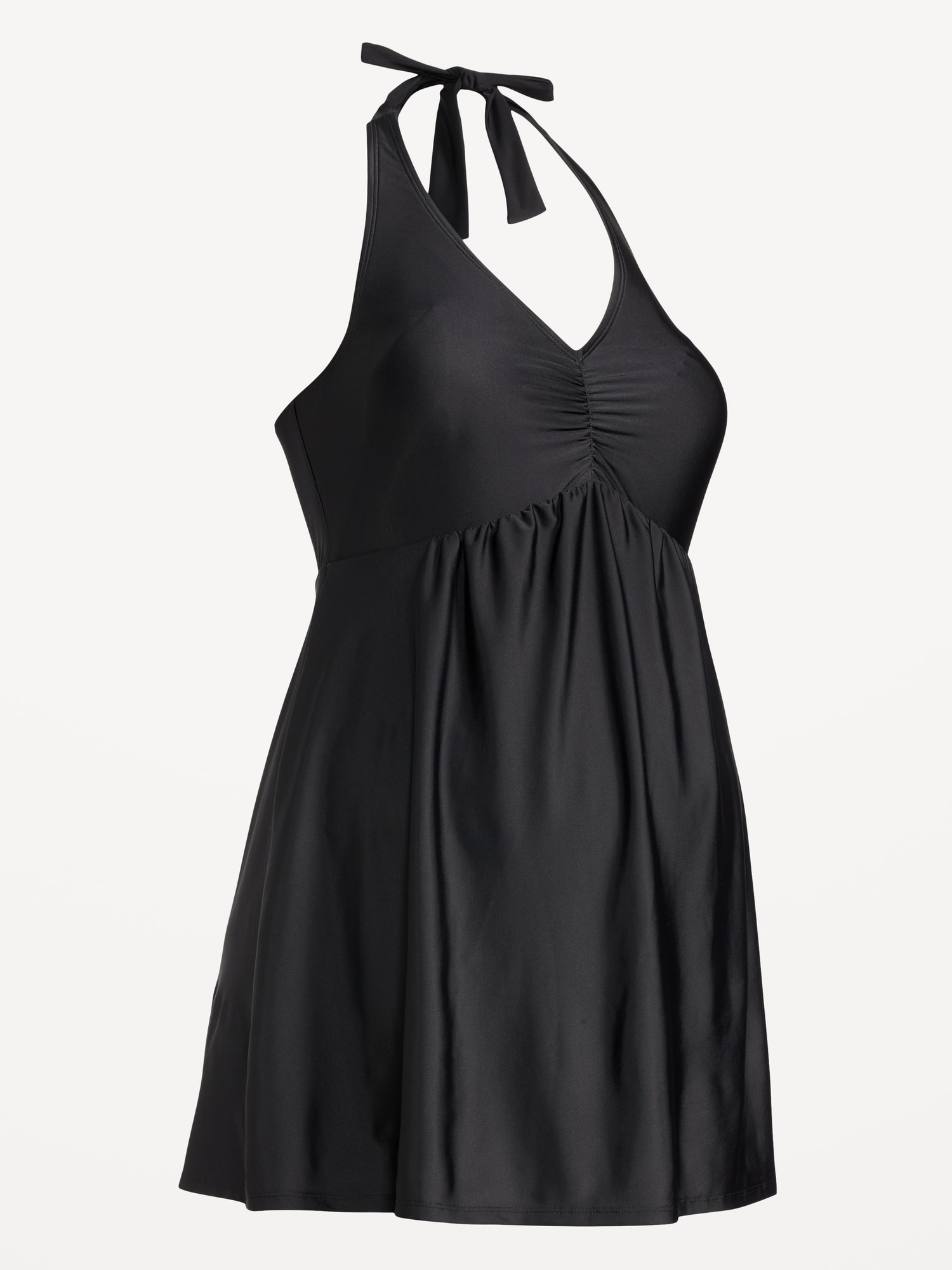 Maternity Halter Swim Dress: deep V-neck, ties at neck, removable molded cups, full skirt, built-in UPF sun protection, #870711