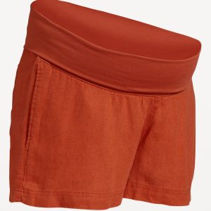 Maternity Linen-Blend Pull-On Shorts — 3.5-inch inseam: foldover jersey waistband, on-seam side pockets, back patch pockets, easy pull-on style, #746574