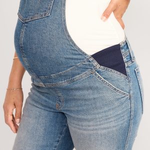 Maternity Side-Panel OG Straight Jean Overalls: Meet our OG Straight Jean. Part ‘90s nostalgia, part new-normal comfort.adjustable shoulder straps attach to metal buttons at front, patch pocket at bib yoke, built-in belt loops at waist, elastic panels at hips, faux fly, diagonal on-seam hip pockets, patch pockets at back, #842309