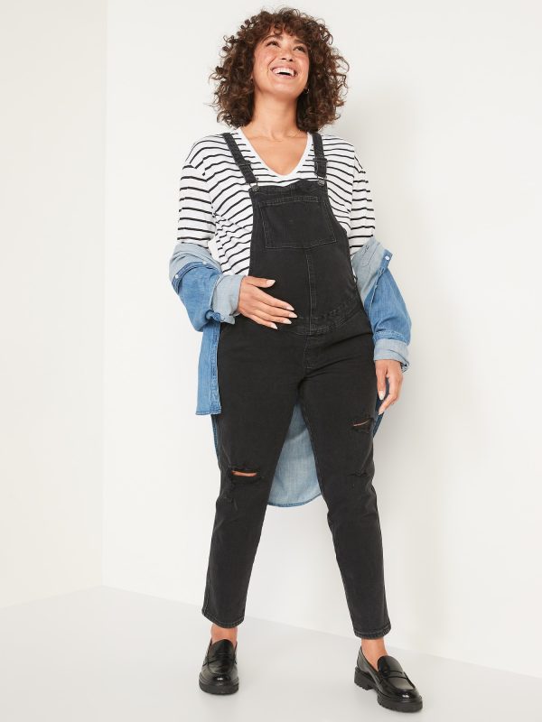 Maternity Side-Panel OG Straight Jean Overalls: Our OG Straight Jean Overalls? Think “mom jeans”…if your mom was a supermodel. Part ‘90s nostalgia, part new-normal comfort, served straight up 😎, Adjustable shoulder straps and metal button fastenings; Patch pocket at bib yoke., Banded waist, with built-in belt loops and discreet elastic side panels at the hips., Faux fly, with fading and whiskering to create a vintage, lived-in look., Soft, durable medium-wash cotton denim, with comfortable stretch., Never-Quit Shape Retention holds its shape and hugs in all the right places, wear after wear., These overalls are made with 5% recycled cotton. Less waste in the world 🌎, #759165