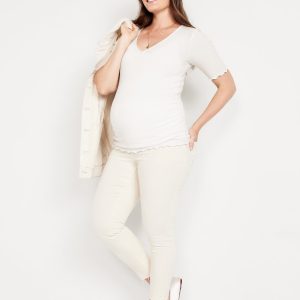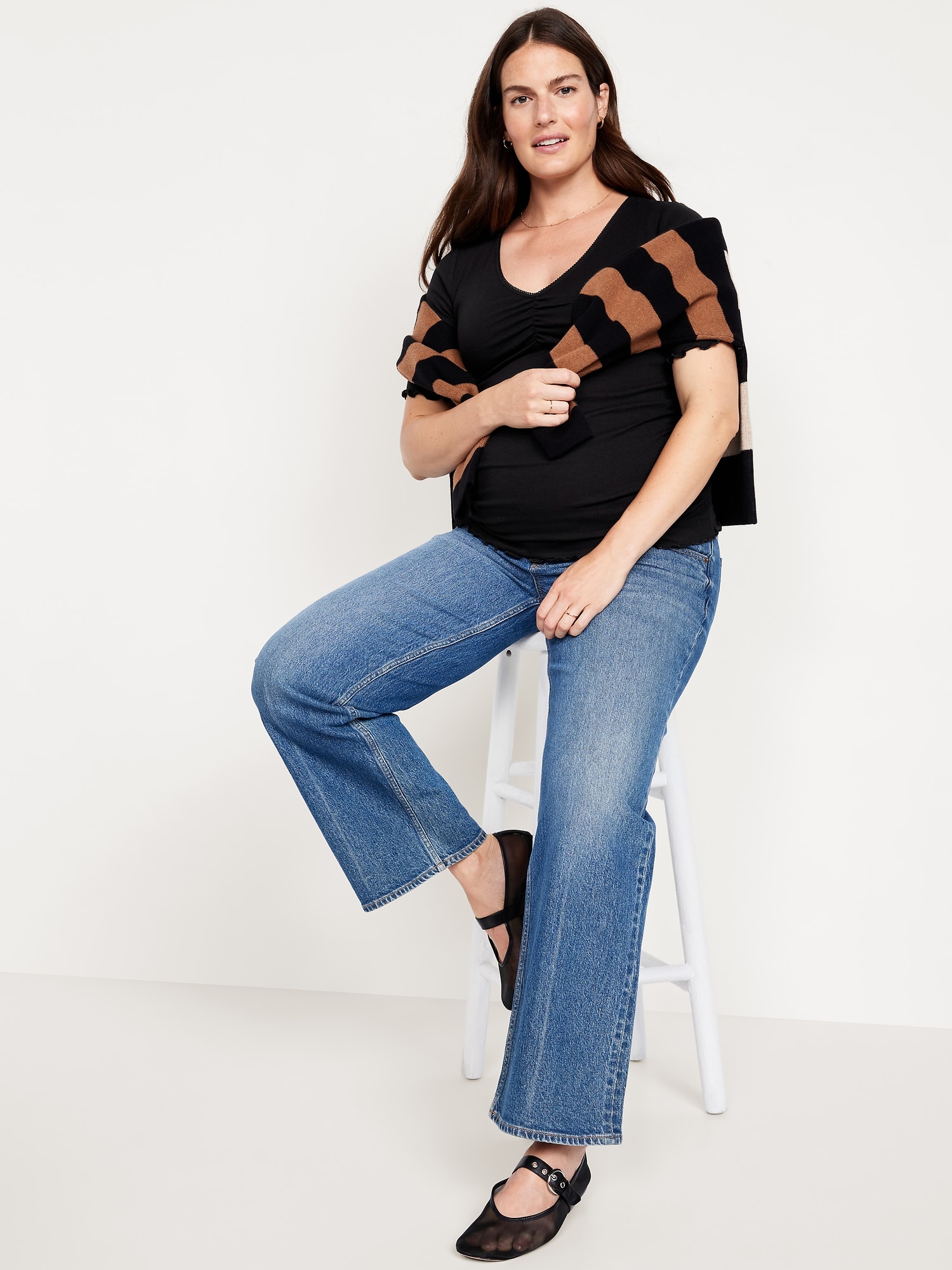 Maternity V-Neck Elbow-Sleeve Top: v-neck, elbow-length sleeves, shirred sides for a flexible fit, lettuce-edge trim, #826402