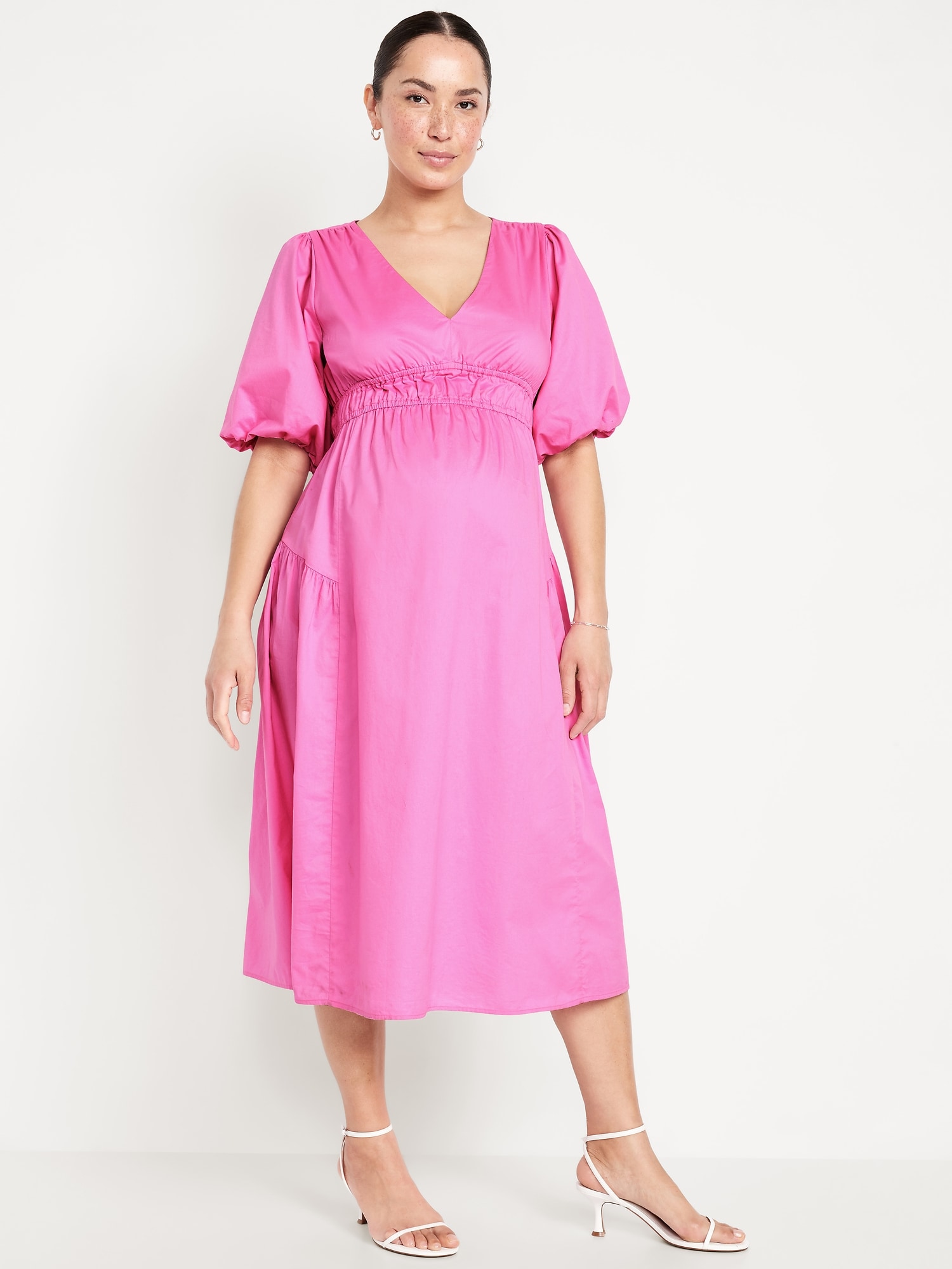 Maternity Waist-Defined Midi Dress: perfect for baby shower, deep v-neck, elbow-length puff sleeves, elasticized empire waist, shirred detail, #750052