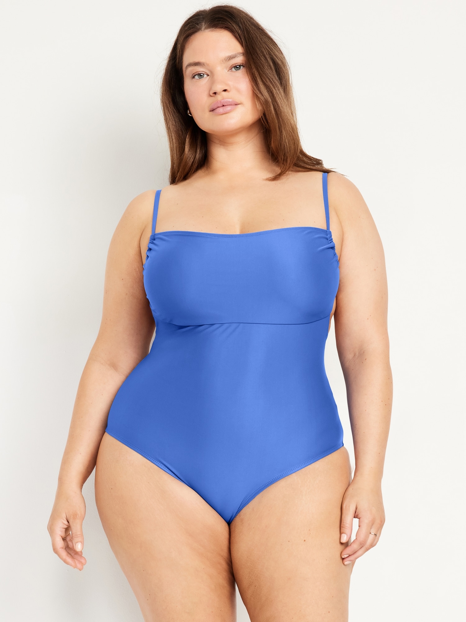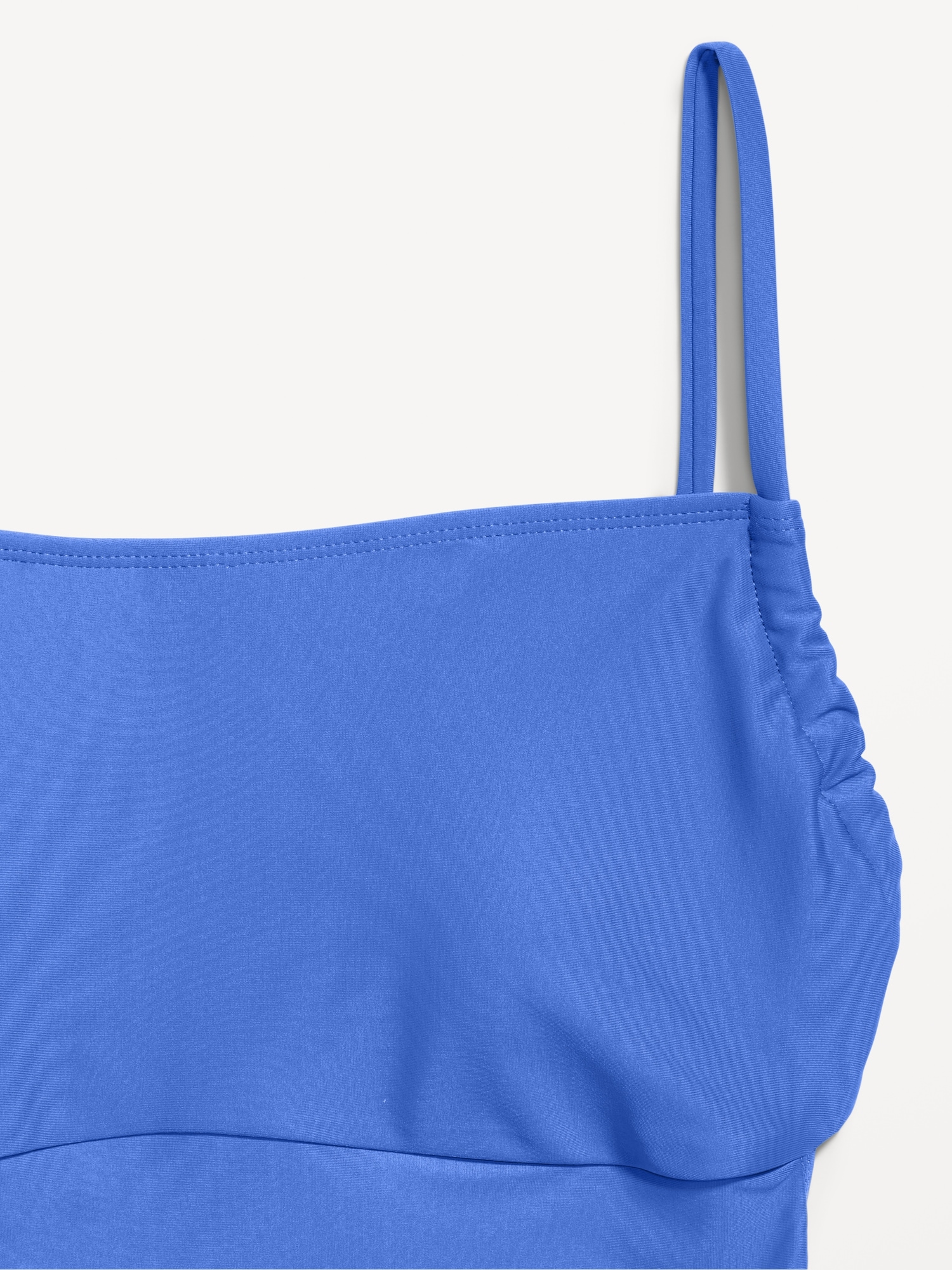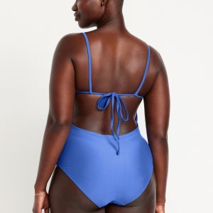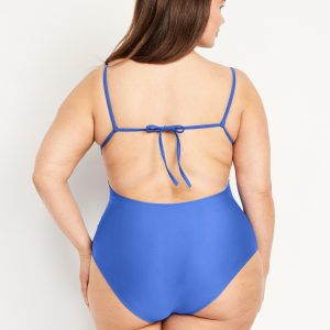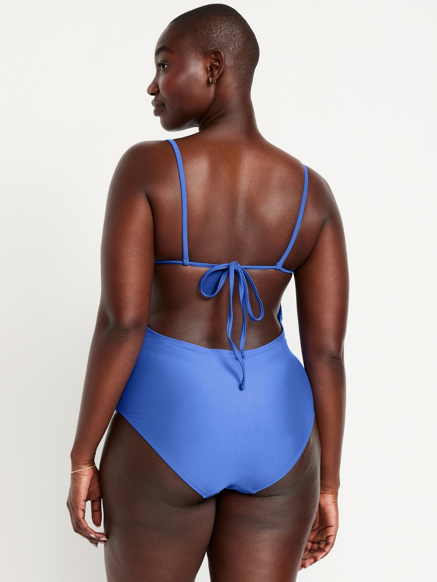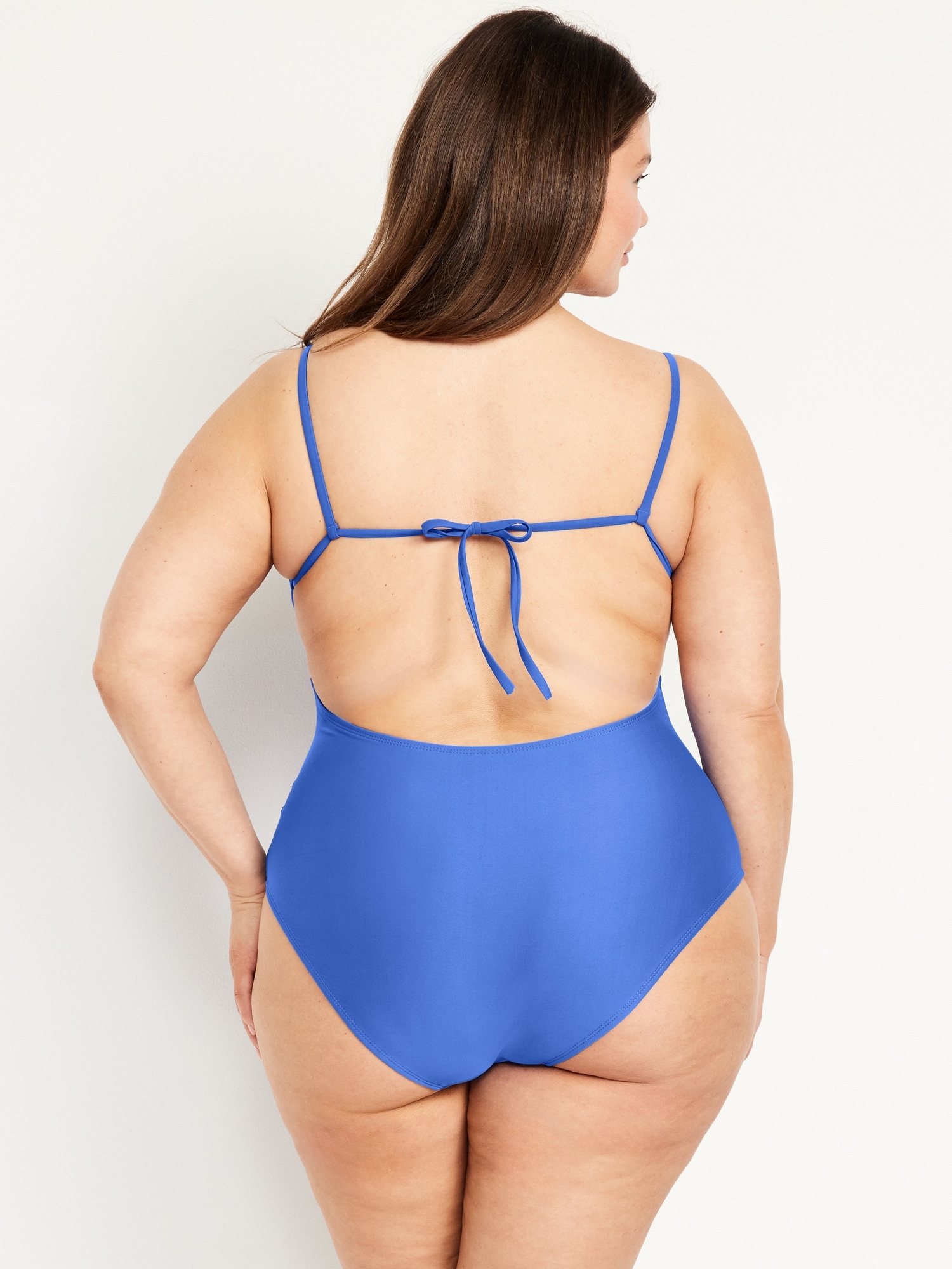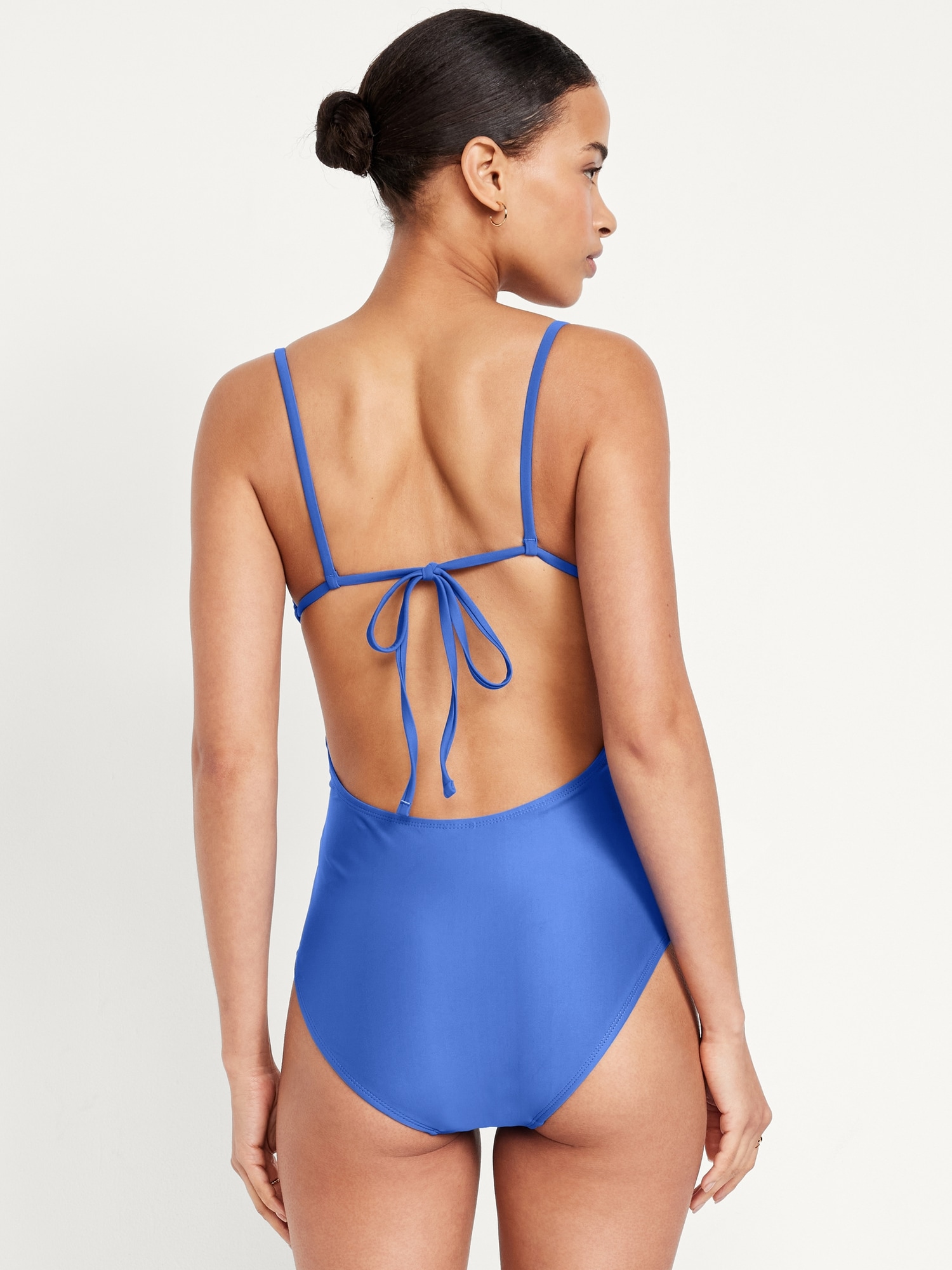 Matte Cutout Back One-Piece Swimsuit: spaghetti straps, ruched bodice, shelf bra, removable pads, cutout back, tie-back closure, elastic leg openings, #660611