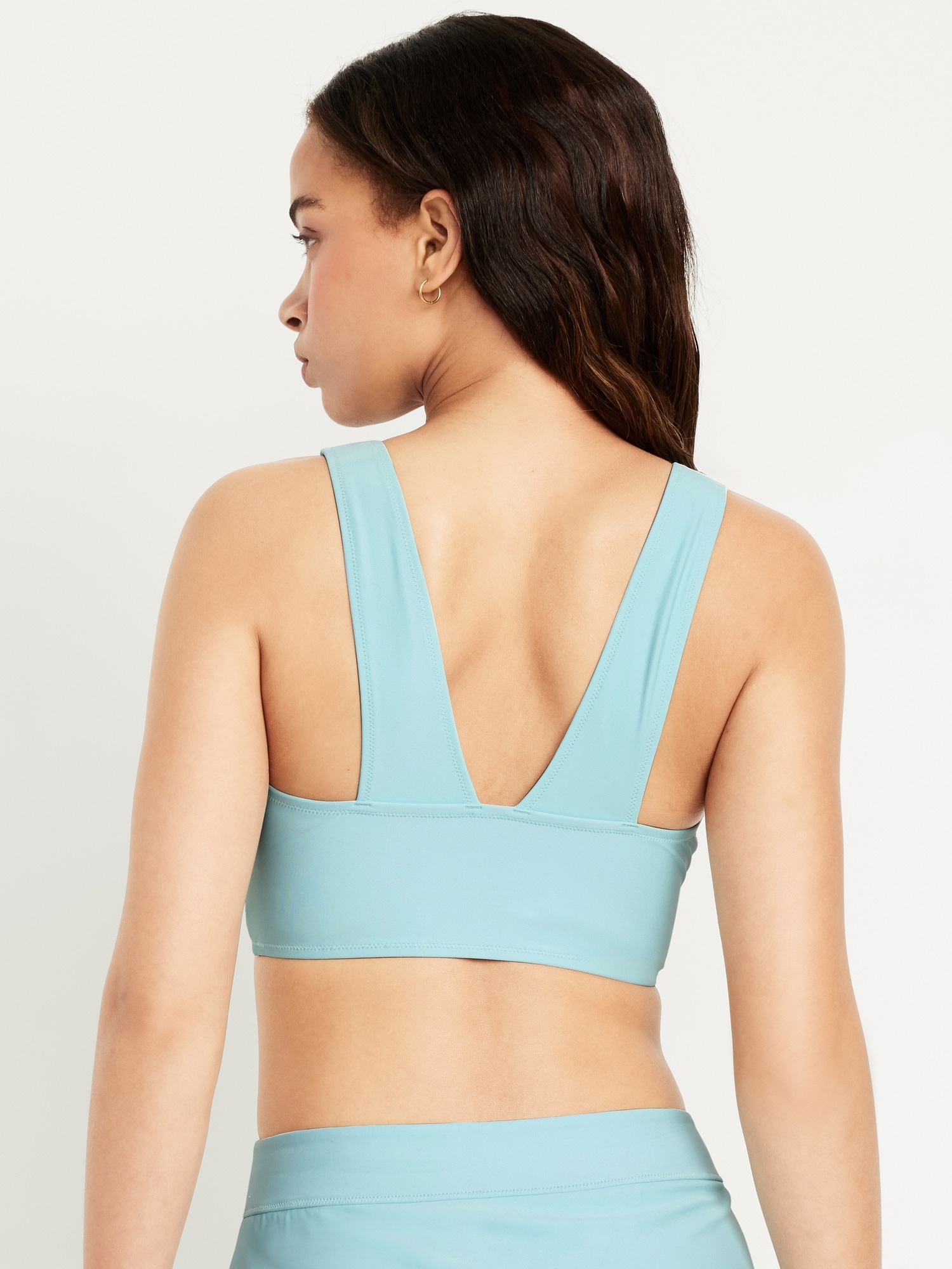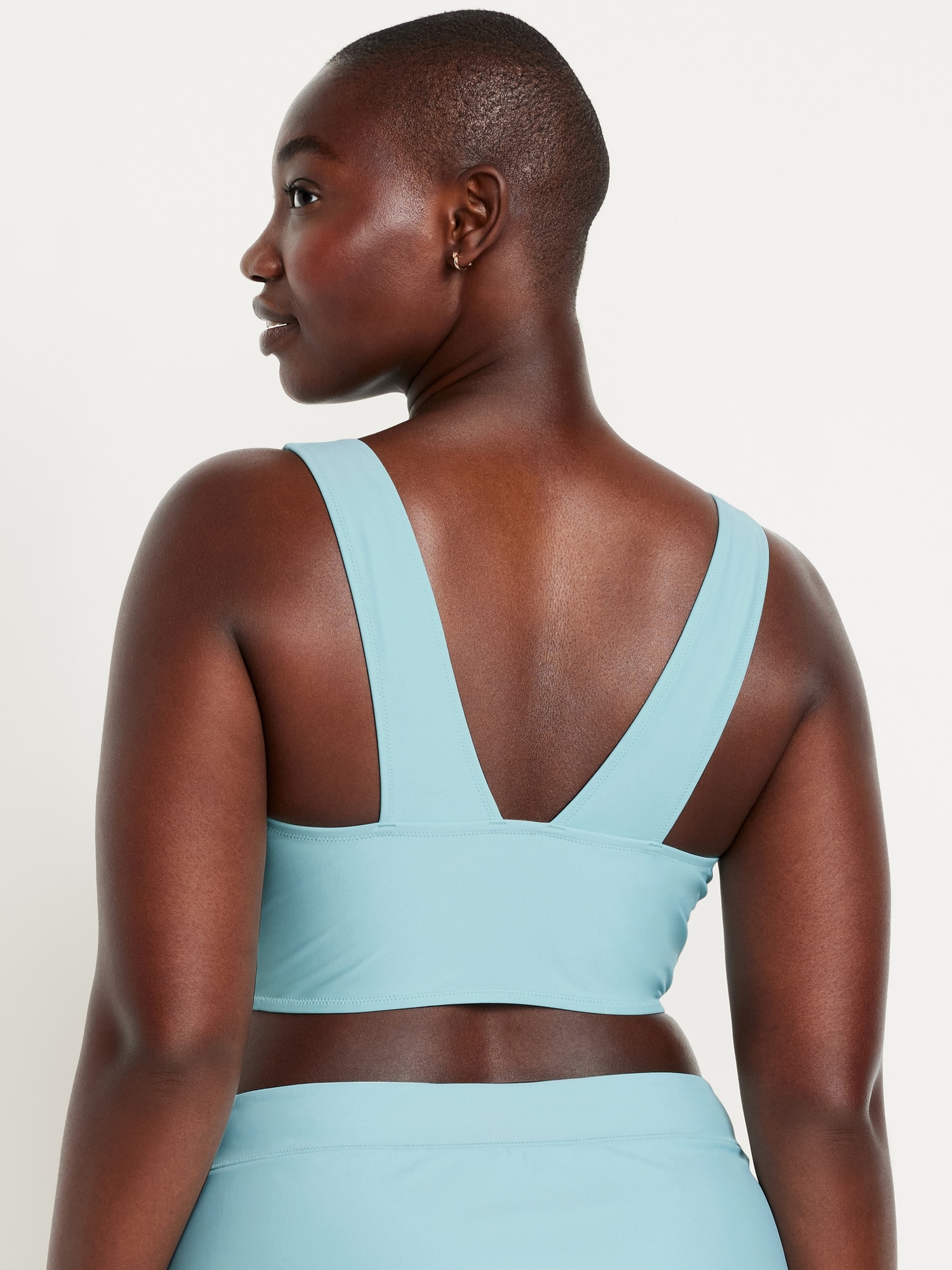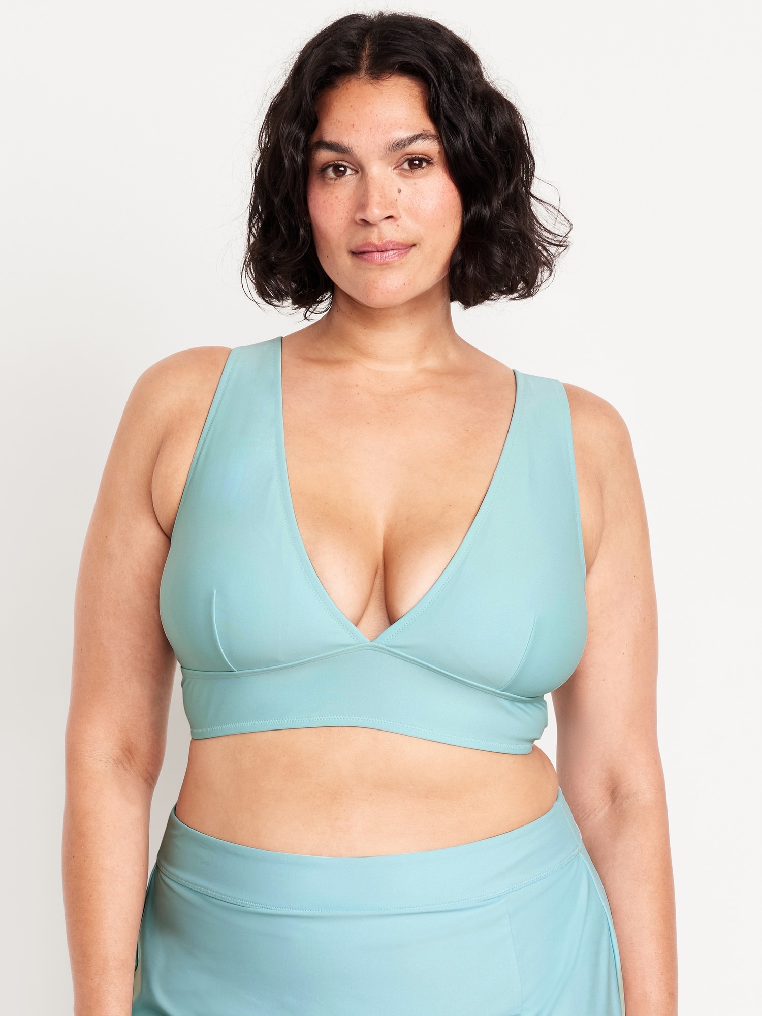 Matte Longline Bikini Swim Top: plunging v-neck, wide straps, removable pads, elastic-banded hem, #865325