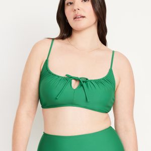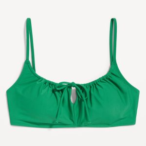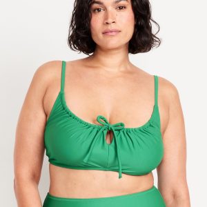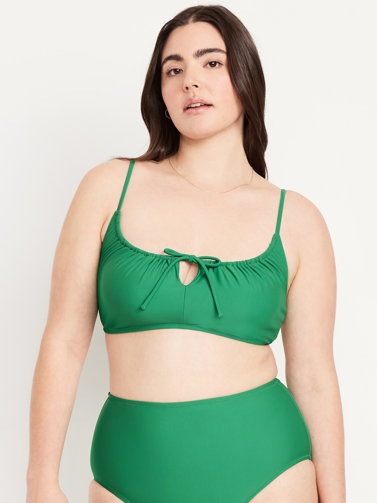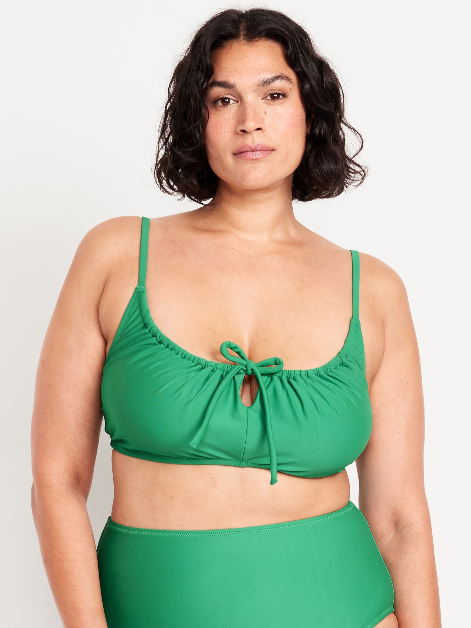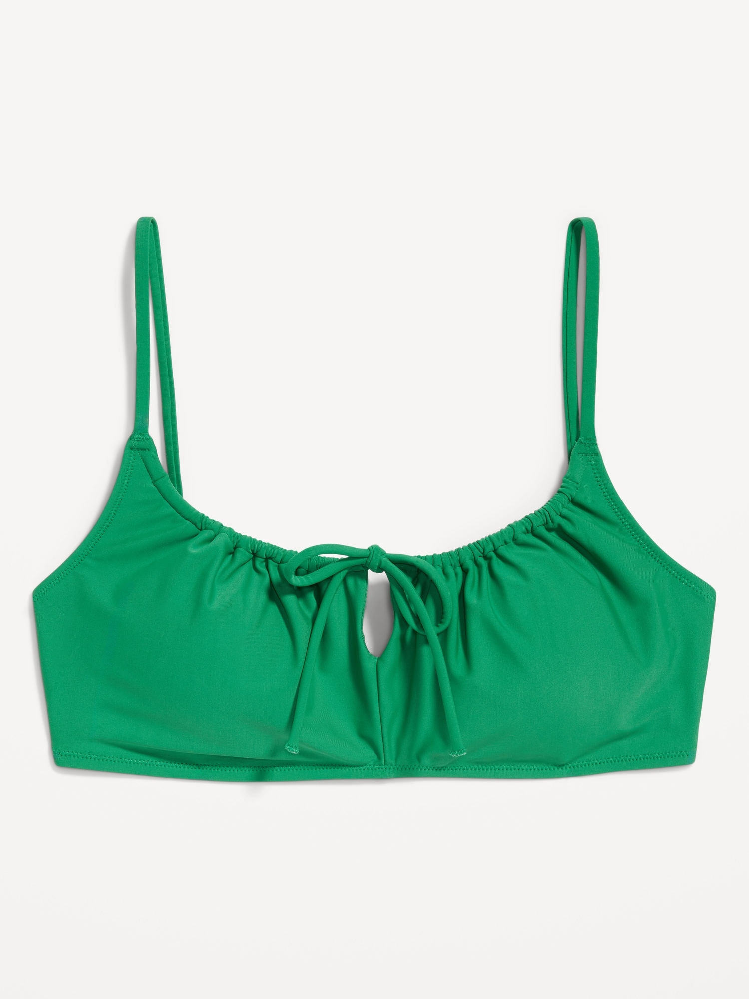 Matte Ruched Bikini Swim Top: adjustable spaghetti straps, scoop neck, tie-front keyhole accent, ruched bodice, removable pads, back clasp, gingham print, #685285