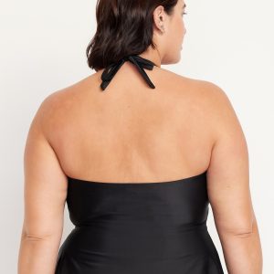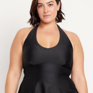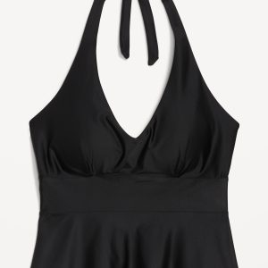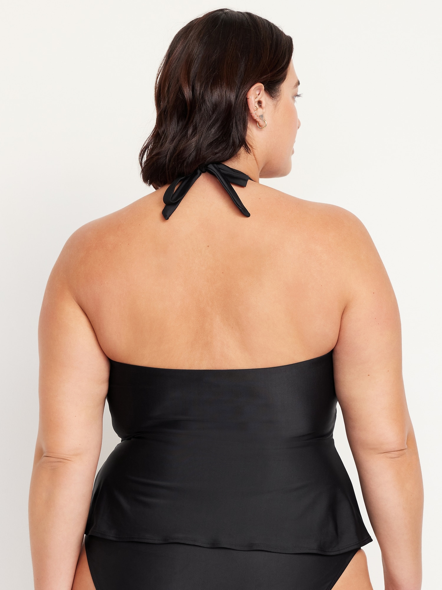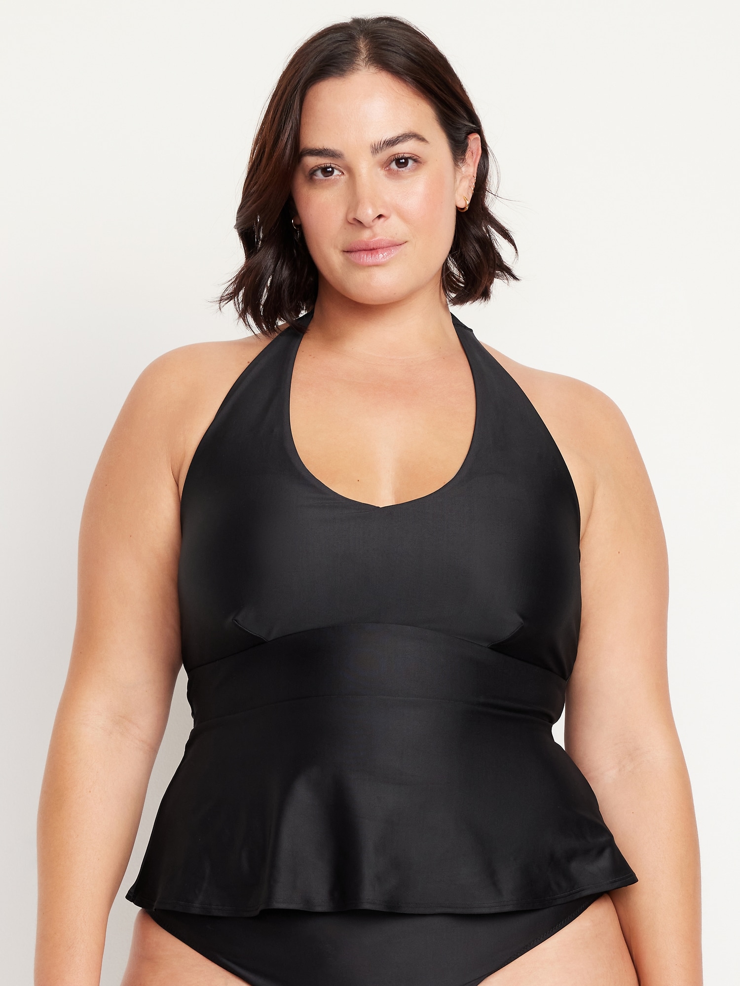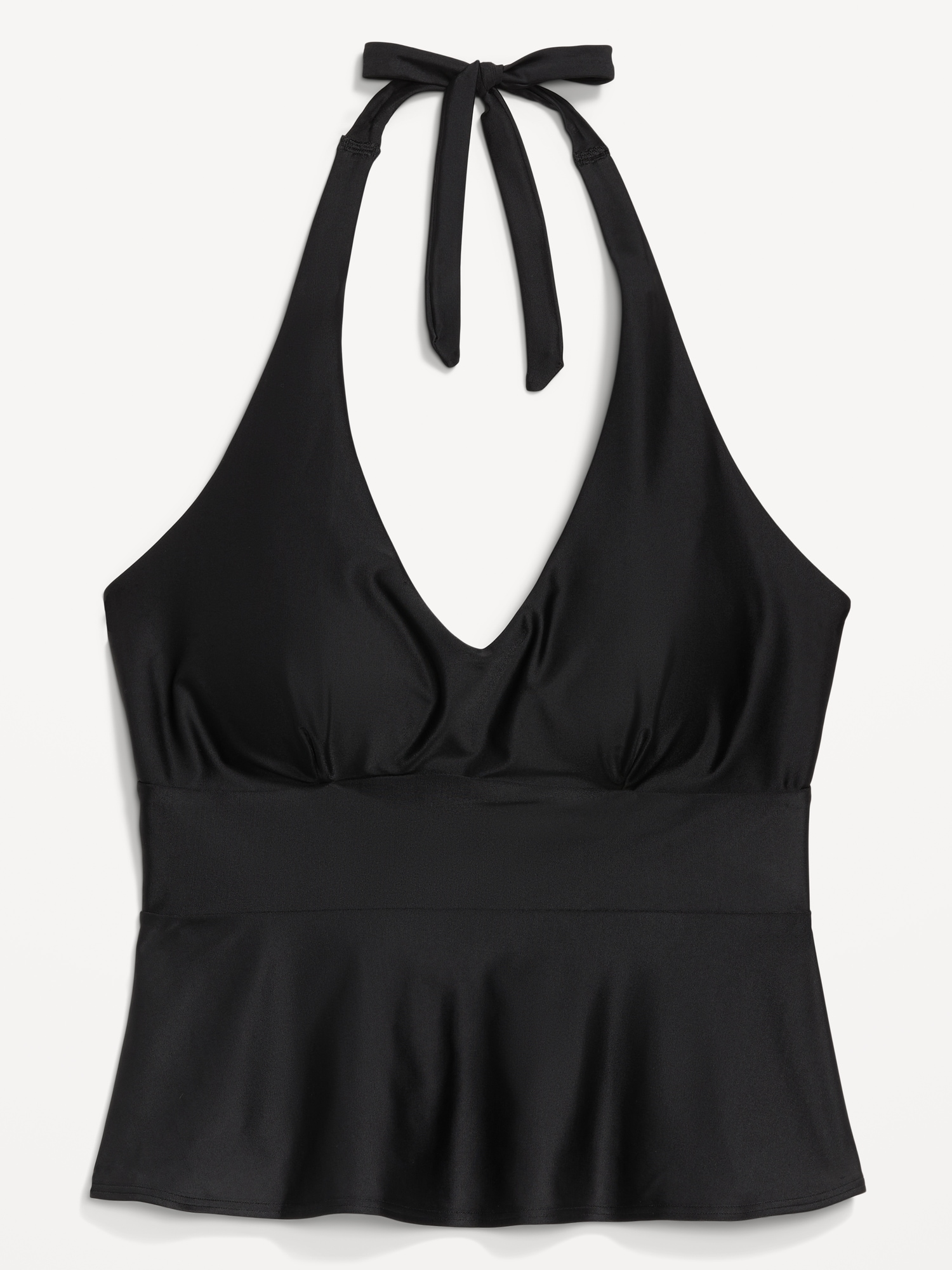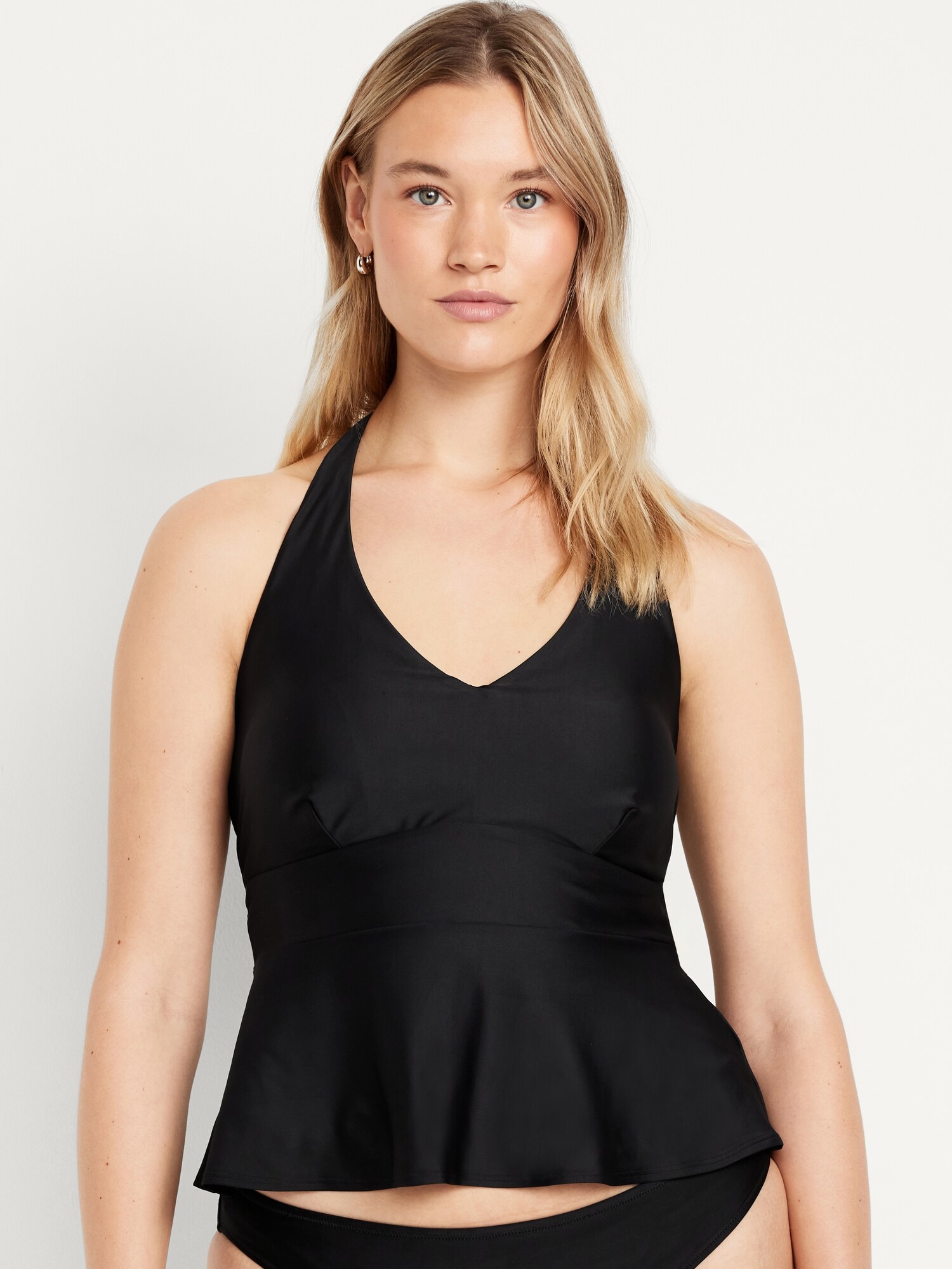 Matte Tankini Swim Top: v-neck, halter tie straps, removable pads, seamed empire waist, darted bust, peplum hem, #660892