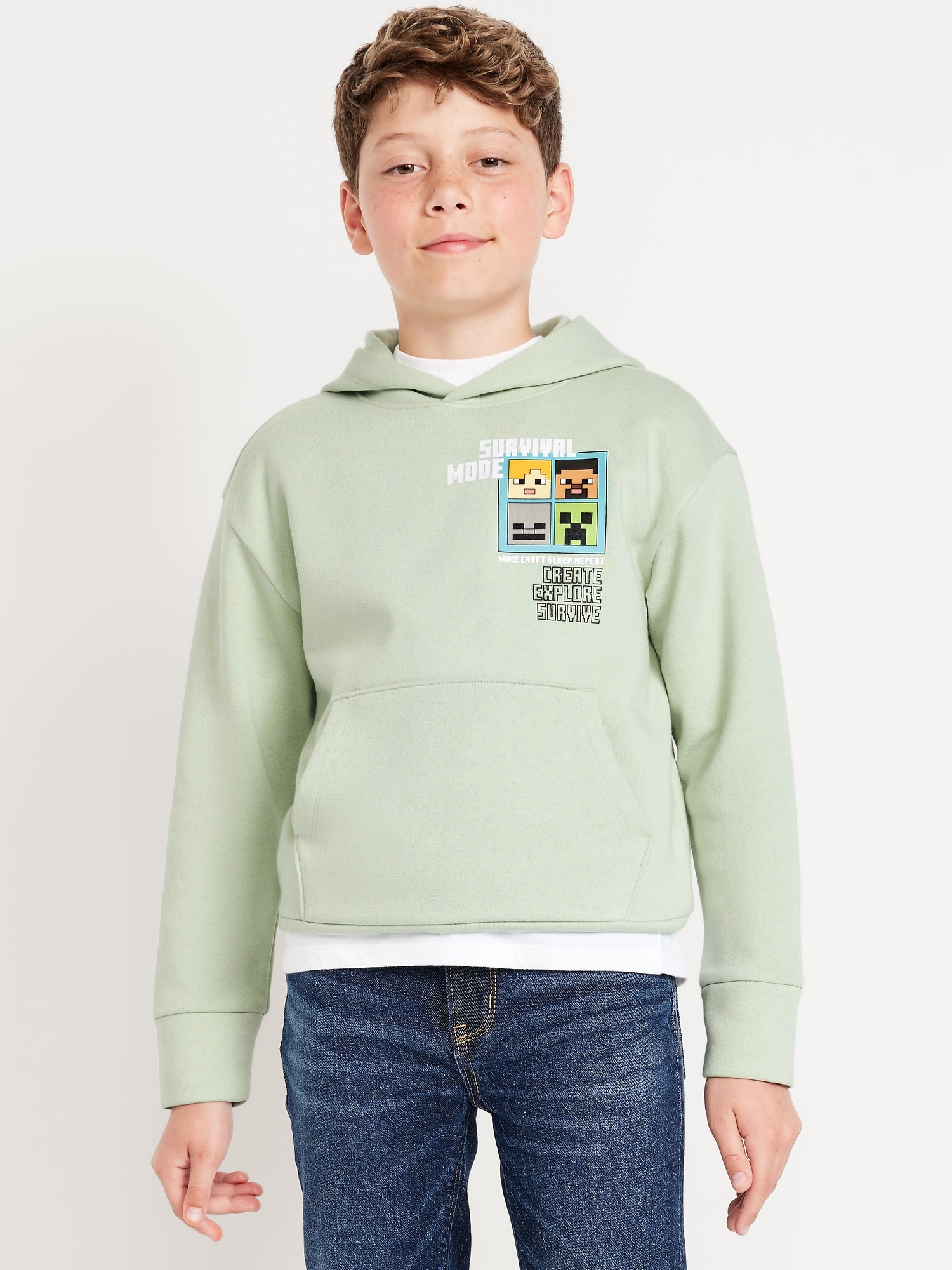 Minecraft™ Gender-Neutral Graphic Pullover Hoodie for Kids: built-in hood, long sleeves, small-scale licensed graphic at front, large-scale licensed graphic, hand-warming pockets, banded hem, ©2025 Mojang AB. All Rights Reserved. Minecraft, the Minecraft logo and the Mojang Studios logo are trademarks of the Microsoft group of companies., #761741