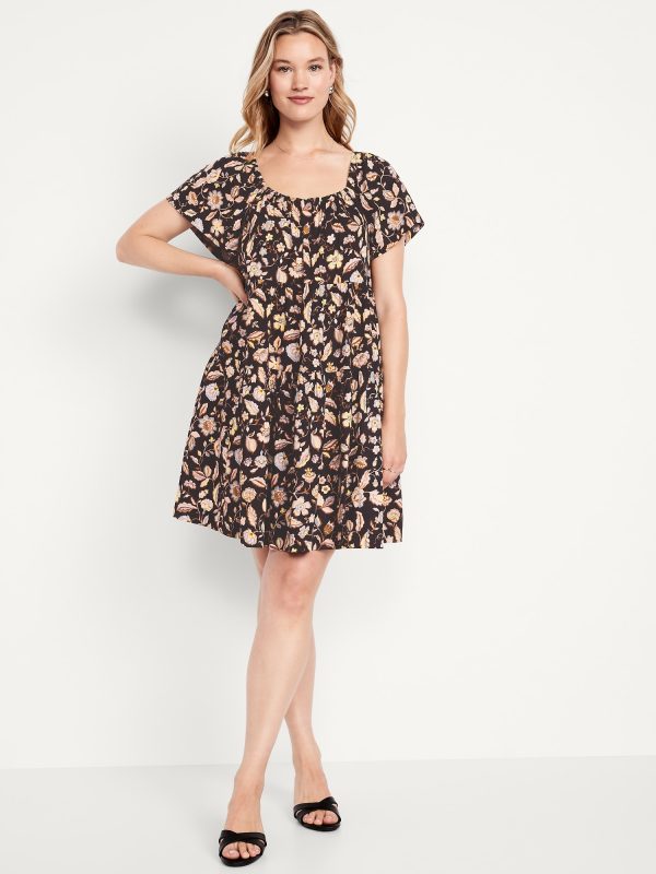Mini Floral Swing Dress: square elastic neckline, flutter sleeves, tiered seams, shirred detail, #809629