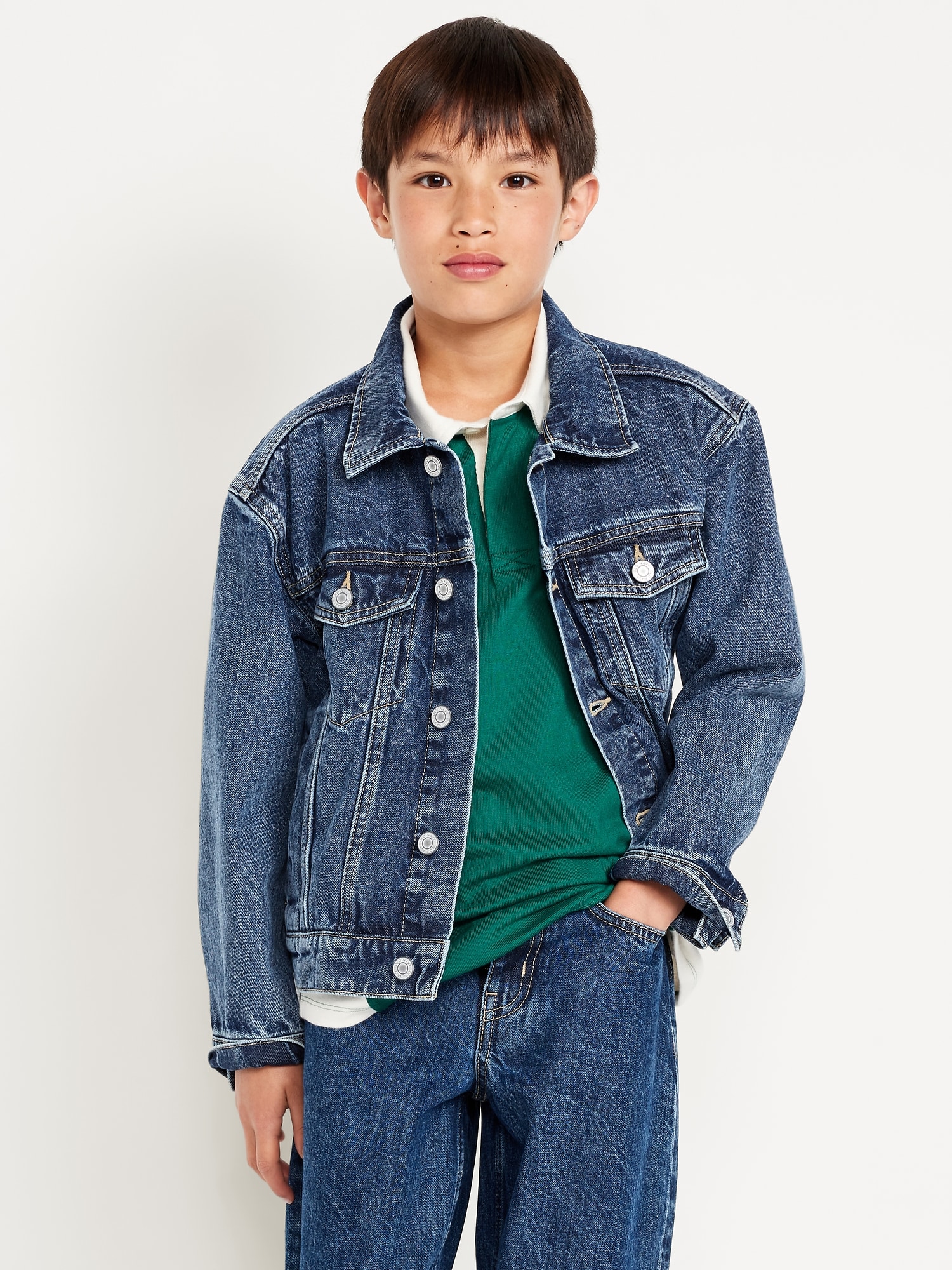 Non-Stretch Jean Trucker Jacket for Boys: spread collar, long sleeves, buttoned cuffs, button-flap pockets at chest, full-length buttoned placket, vertical welt pockets, #800739