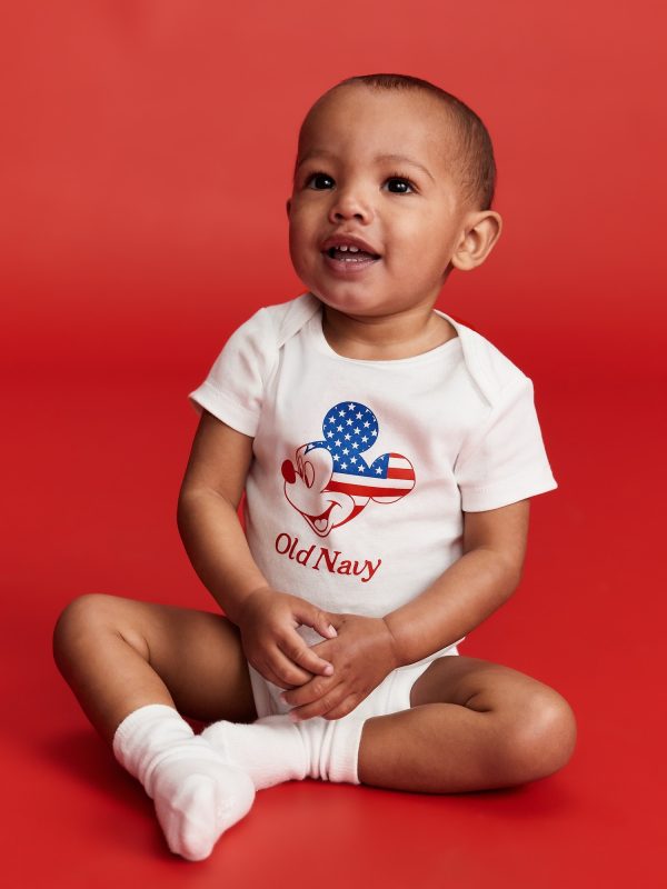 Old Navy x Disney© Mickey Mouse Flag Logo-Graphic Bodysuit for Baby: Two icons, together at last. Family matching for the crew!rib-knit envelope neckline, short sleeves, snaps along inseam, licensed graphic, Disney©, #776474
