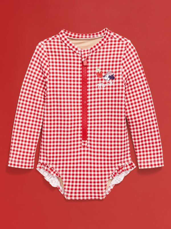 Old Navy x Disney© Minnie Mouse Zip-Front Rashguard One-Piece Swimsuit for Baby: Two icons, together at last. Browse the collection for the whole fam.crew neck, long sleeves, center zipper, elasticized leg openings, hidden snaps at inseam, ruffle trim along leg openings, all-over licensed print, Disney©, #761795