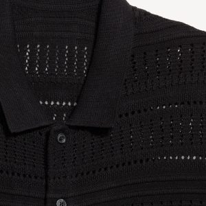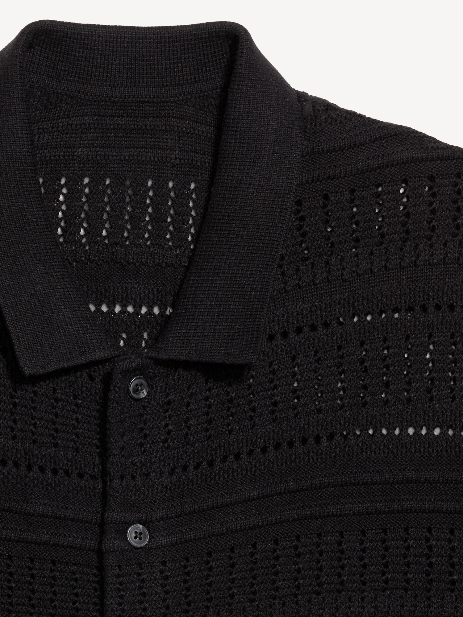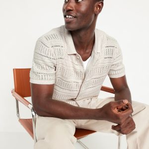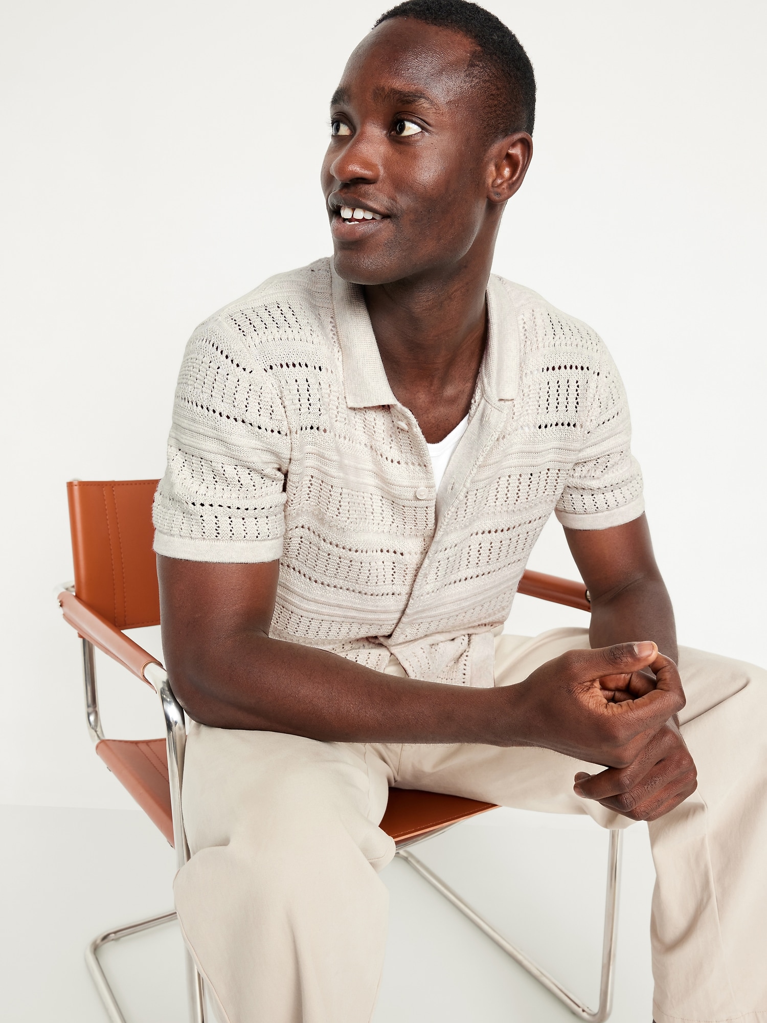 Open-Stitch Sweater: spread collar, short sleeves, full-button front, textured patterns vary, #762317