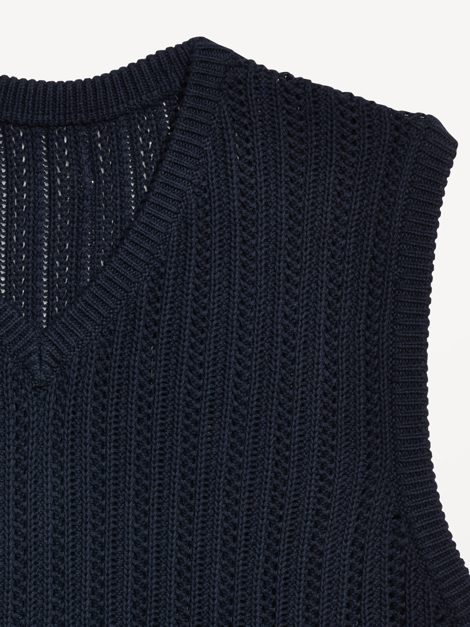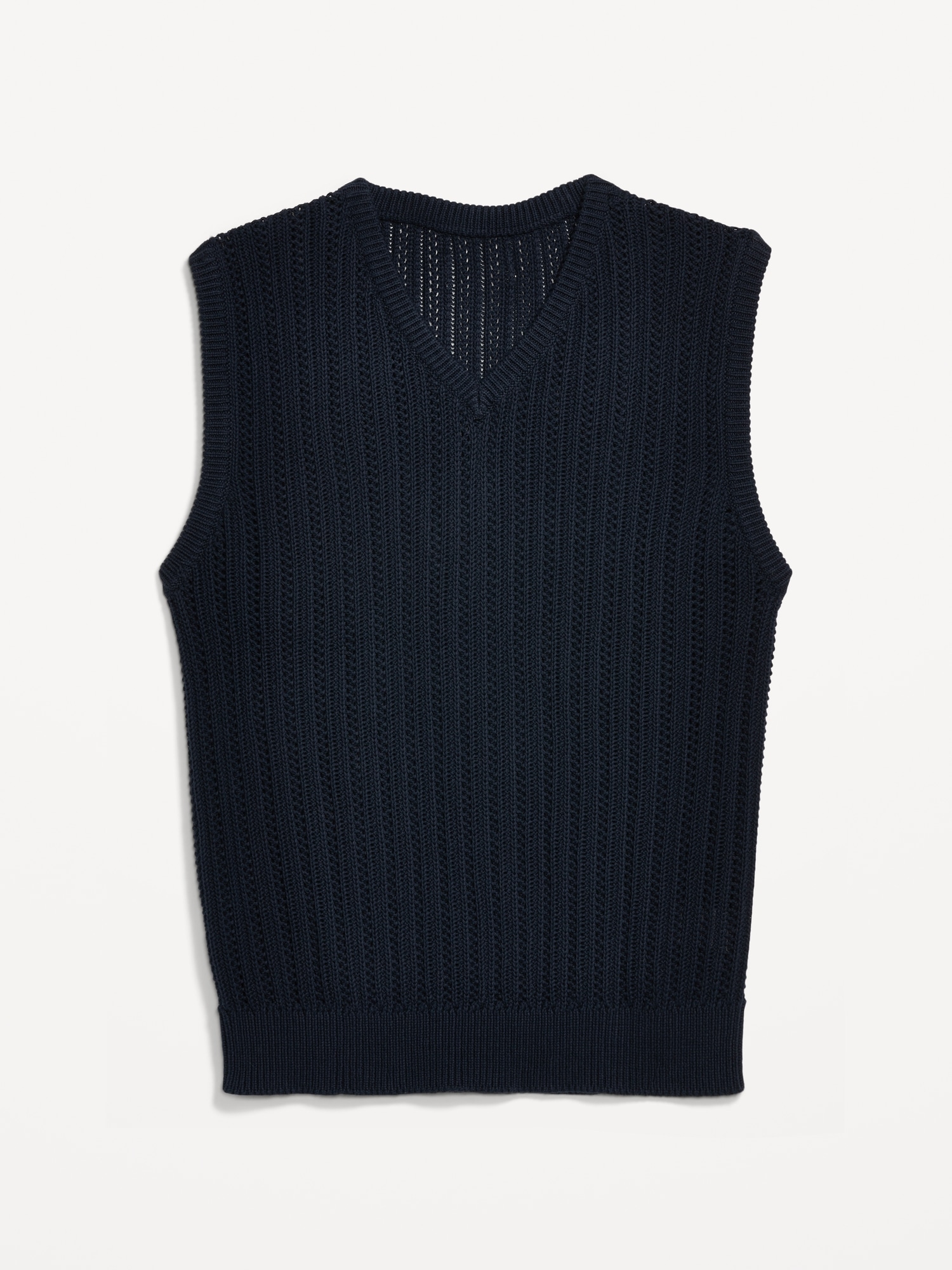 Open-Stitch Sweater Vest: v-neck, sleeveless, ribbed open-stitch yarn, #779517