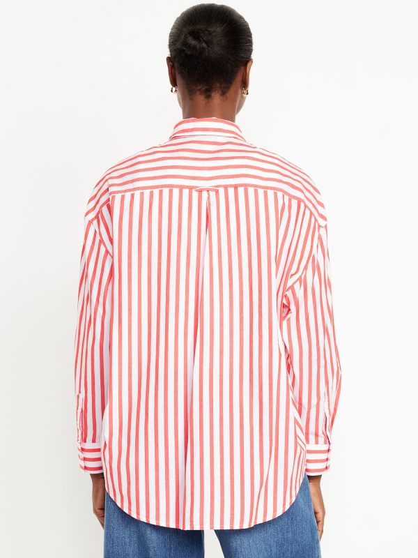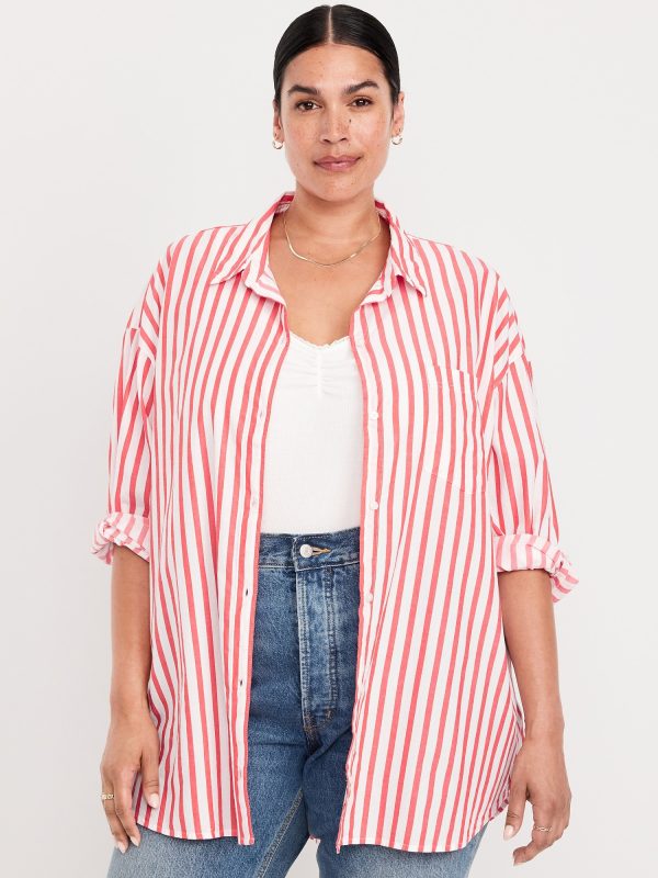 Oversized Button-Down Boyfriend Shirt: spread collar, long sleeves with buttoned cuffs, full-button front, patch chest pocket, curved hem, vertical stripes, #798437