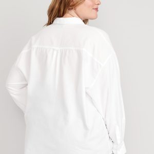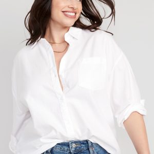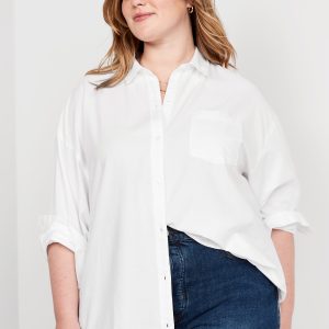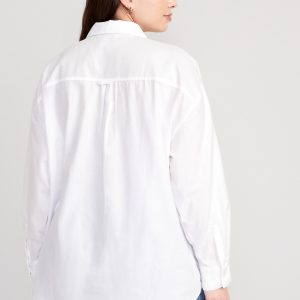 Oversized Button-Down Boyfriend Shirt: spread collar, long sleeves with buttoned cuffs, full-button front, patch chest pocket, curved hem, vertical stripes, #798437
