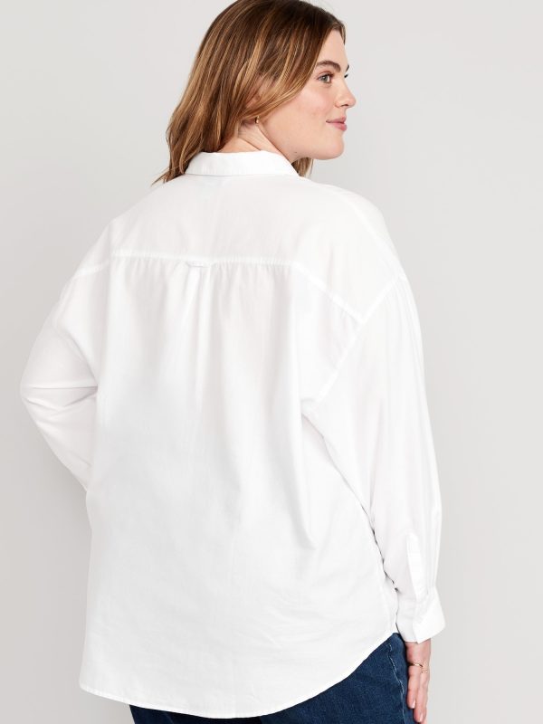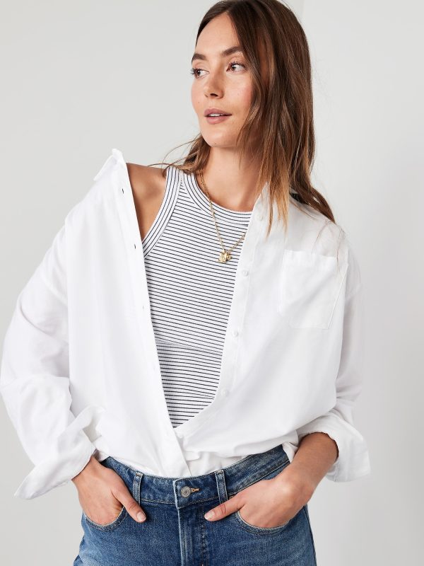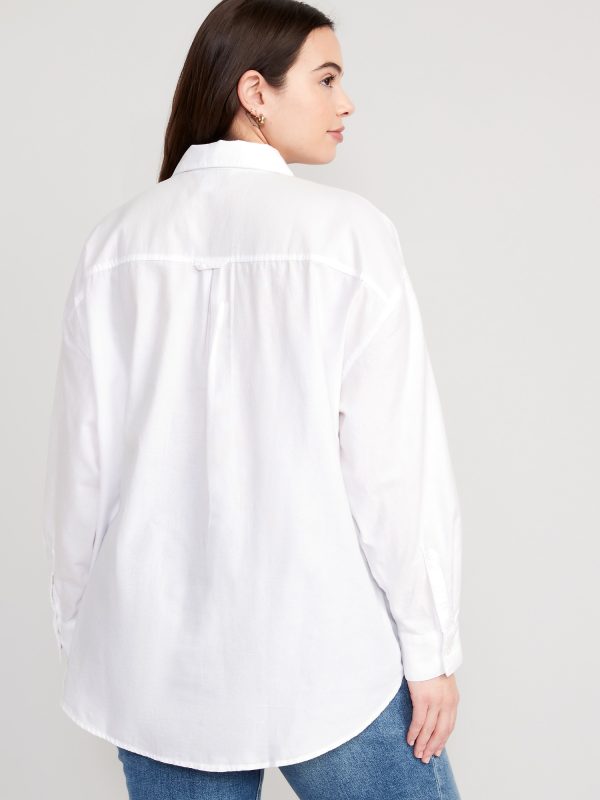 Oversized Button-Down Boyfriend Shirt: spread collar, long sleeves with buttoned cuffs, full-button front, patch chest pocket, curved hem, vertical stripes, #798437