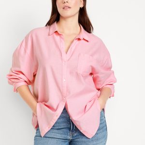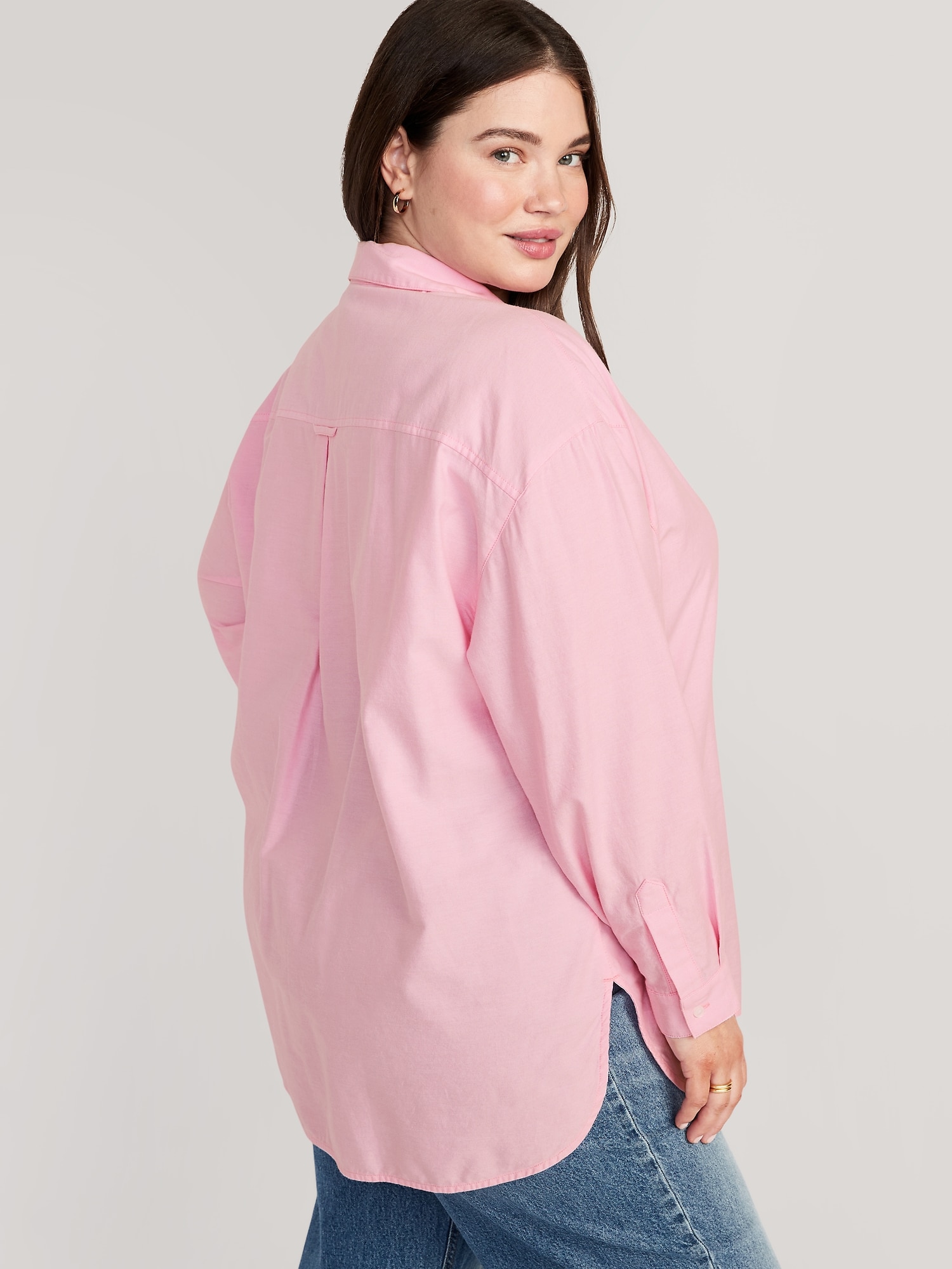 Oversized Button-Down Boyfriend Shirt: spread collar, long sleeves with buttoned cuffs, full-button front, patch chest pocket, curved hem, vertical stripes, #798437