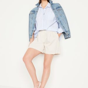 Oversized Button-Down Boyfriend Shirt: spread collar, long sleeves with buttoned cuffs, full-button front, patch chest pocket, curved hem, vertical stripes, #798437