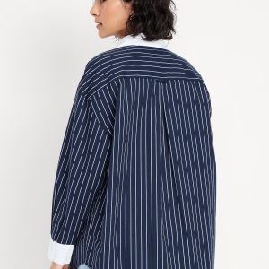 Oversized Button-Down Boyfriend Shirt: spread collar, long sleeves with buttoned cuffs, full-button front, patch chest pocket, curved hem, vertical stripes, #798437