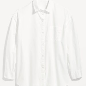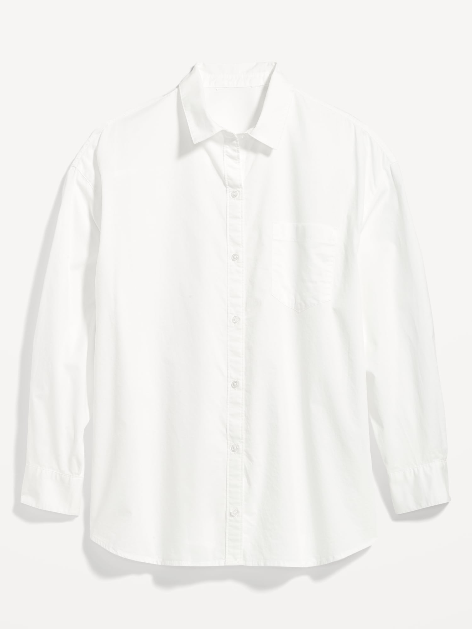 Oversized Button-Down Boyfriend Shirt: spread collar, long sleeves with buttoned cuffs, full-button front, patch chest pocket, curved hem, vertical stripes, #798437